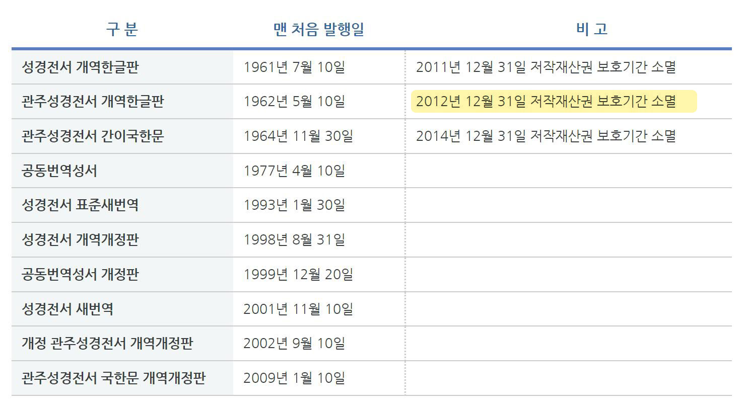 2012년 12월 31일 저작재산권 보호기간 소멸되어 누구나 자유롭게 사용이 가능하지만, '대한성서공회'의 저작권이 없어지는 것은 아닙니다. 이용에 참고하시기 바랍니다.