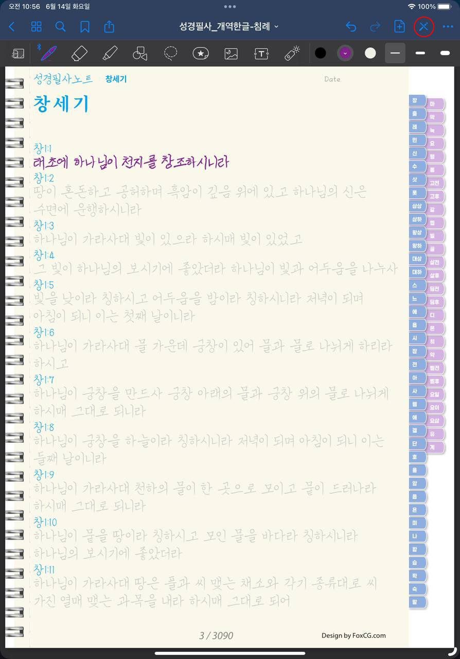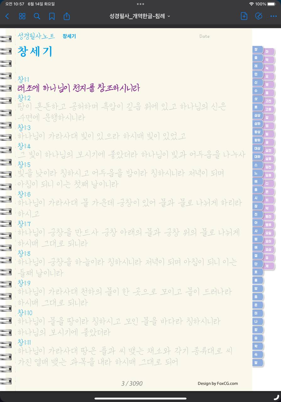 지난번에 공유한 성경필사 속지 양식을 이용하여 필사를 할 수도 있지만, 스플릿뷰 모드를 이용하여 화면을 분할하여 좁은 필기 영역을 사용해야 하고, 필체 연습을 하기 불편하다는 단점이 있어서 '개역한글판' 성경 전체를 적용한 '성경필사노트'를 만들었습니다.