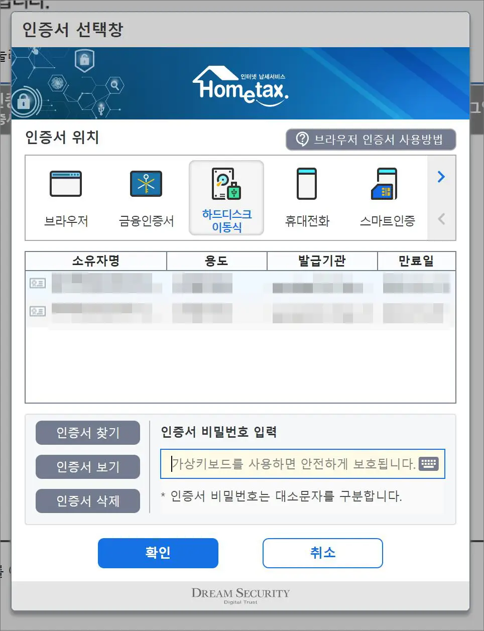 인증서는 금융인증서, 브라우저 인증서, 휴대전화 인증서 등 다양한 인증방식을 사용할 수 있습니다.