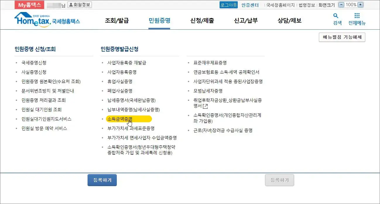 상단 메뉴의 [민원증명] 메뉴에서 '민원증명발급신청' 탭의 '소득금액 증명'을 선택합니다.