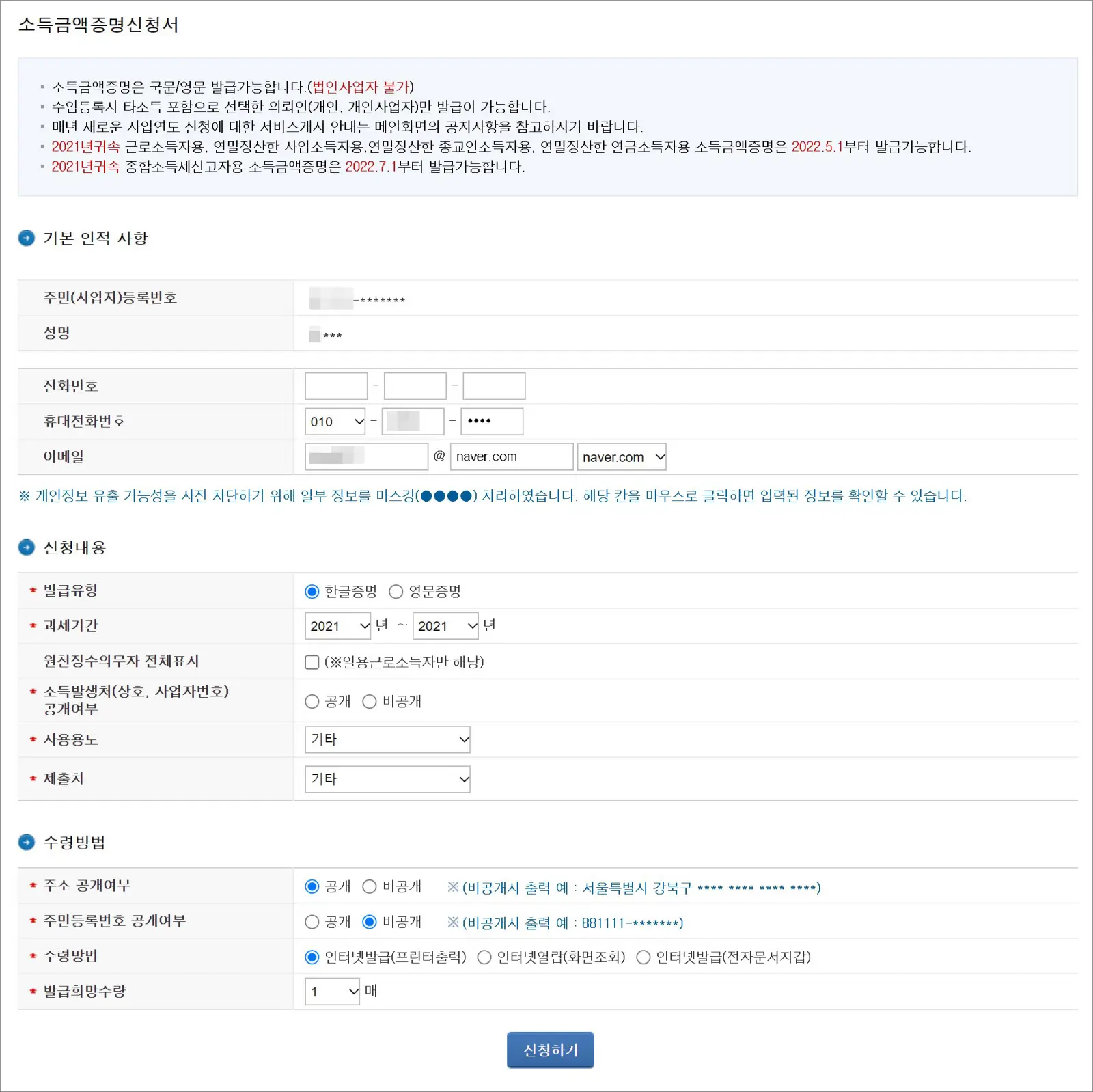 위와 같이 인적사항과 신청내용 및 수령방법을 선택합니다. 프린터 출력이나 화면 조회등 원하는 방법을 선택할 수 있습니다.