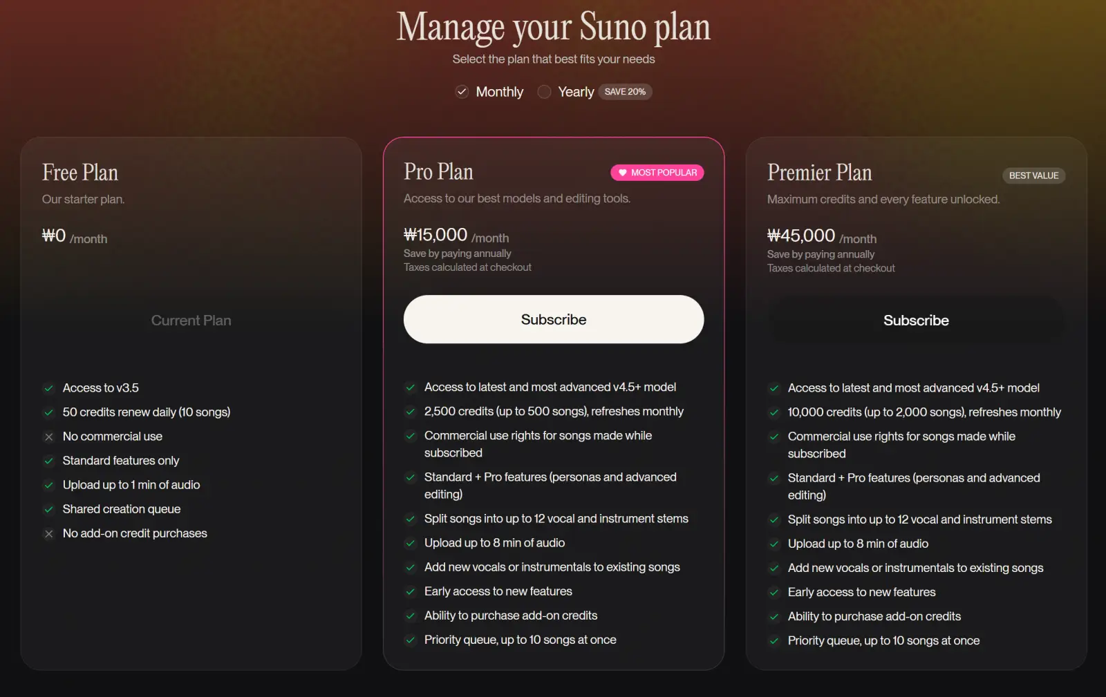 | 음악 생성량 | 매일 50크레딧 (10곡) | Pro: 2,500 크레딧 (최대 500곡), Premier: 10,000 크레딧 (최대 2,000곡) |