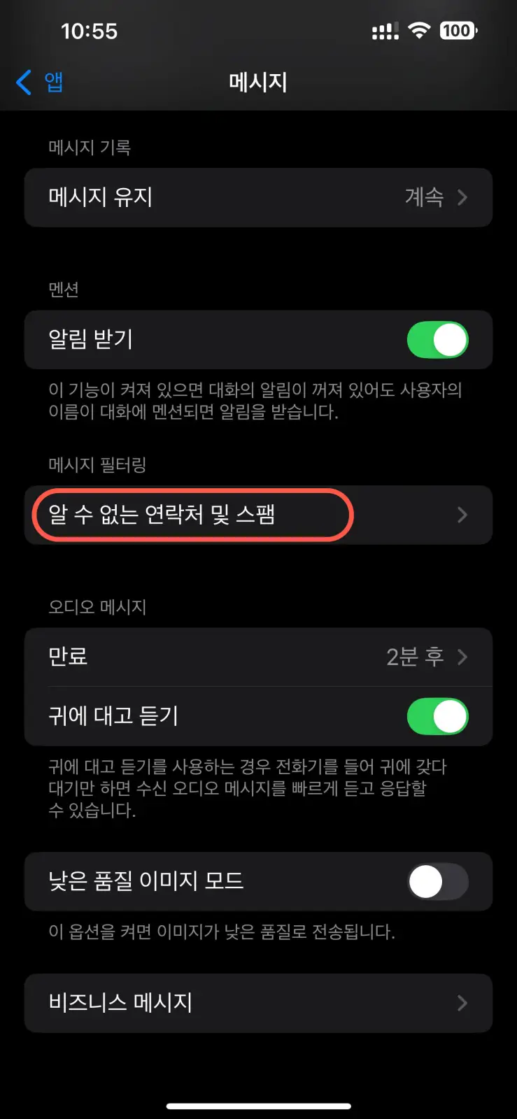 - 기본 설정: 아이폰 설정 앱에서 '메시지'로 이동한 후 '알 수 없는 발신자 필터링하기'를 켜고 'Smart Spam Filter'를 체크합니다.