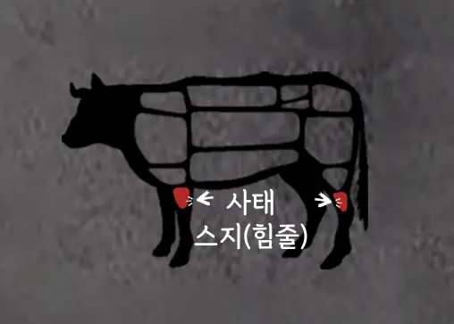 스지는 소의 아킬레스건, 도가니 근처, 앞다리, 채끝 등 여러 부위에 산재해 있어 이를 추출해 요리에 사용합니다.