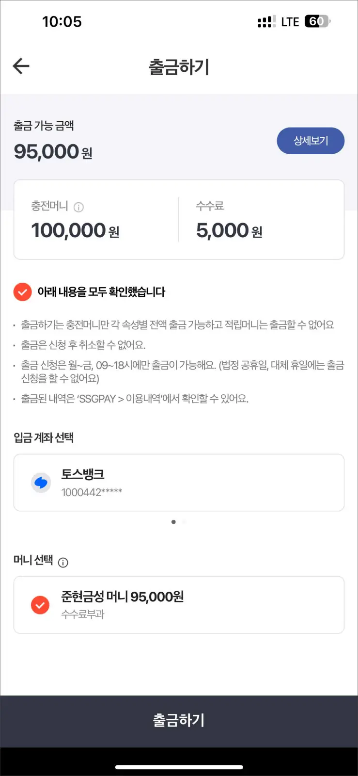 연결된 계좌로 남은 SSG MONEY를 출금할 수 있습니다.