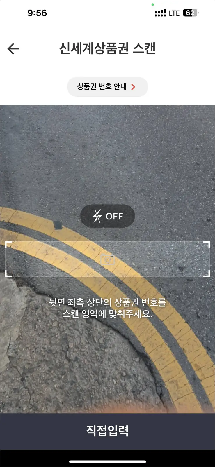 신세계상품권을 선택 후 위와 같이 상품권을 스캔하면 상품권을 SSG MONEY 로 충전할 수 있습니다.