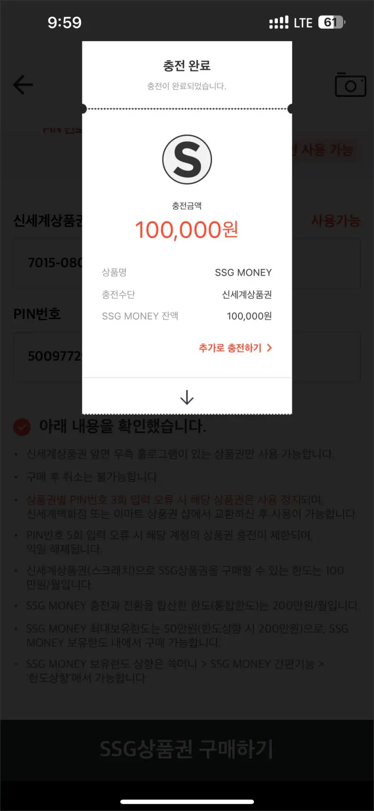 SSG 상품권이나 문화상품권도 동일하게 충전이 가능합니다.