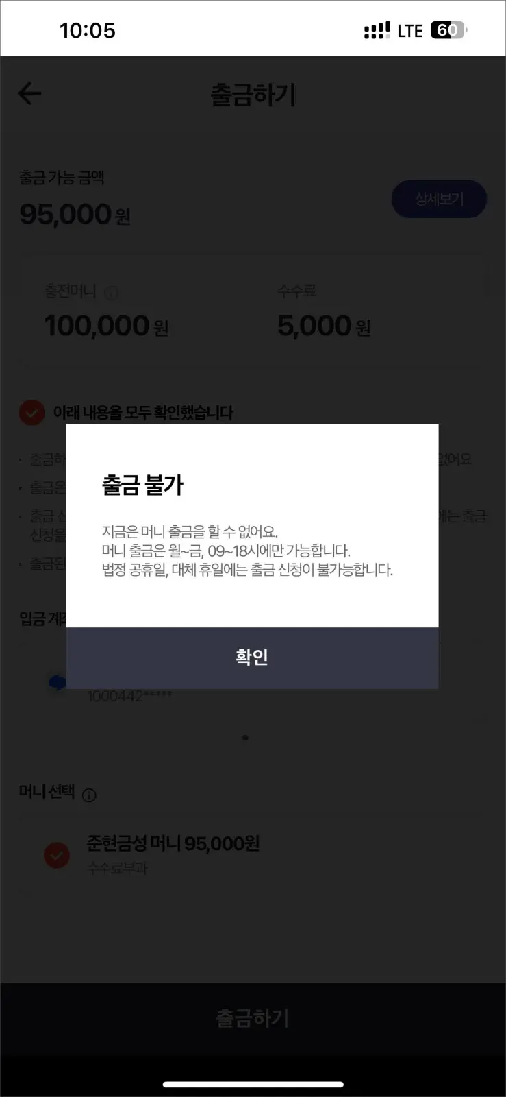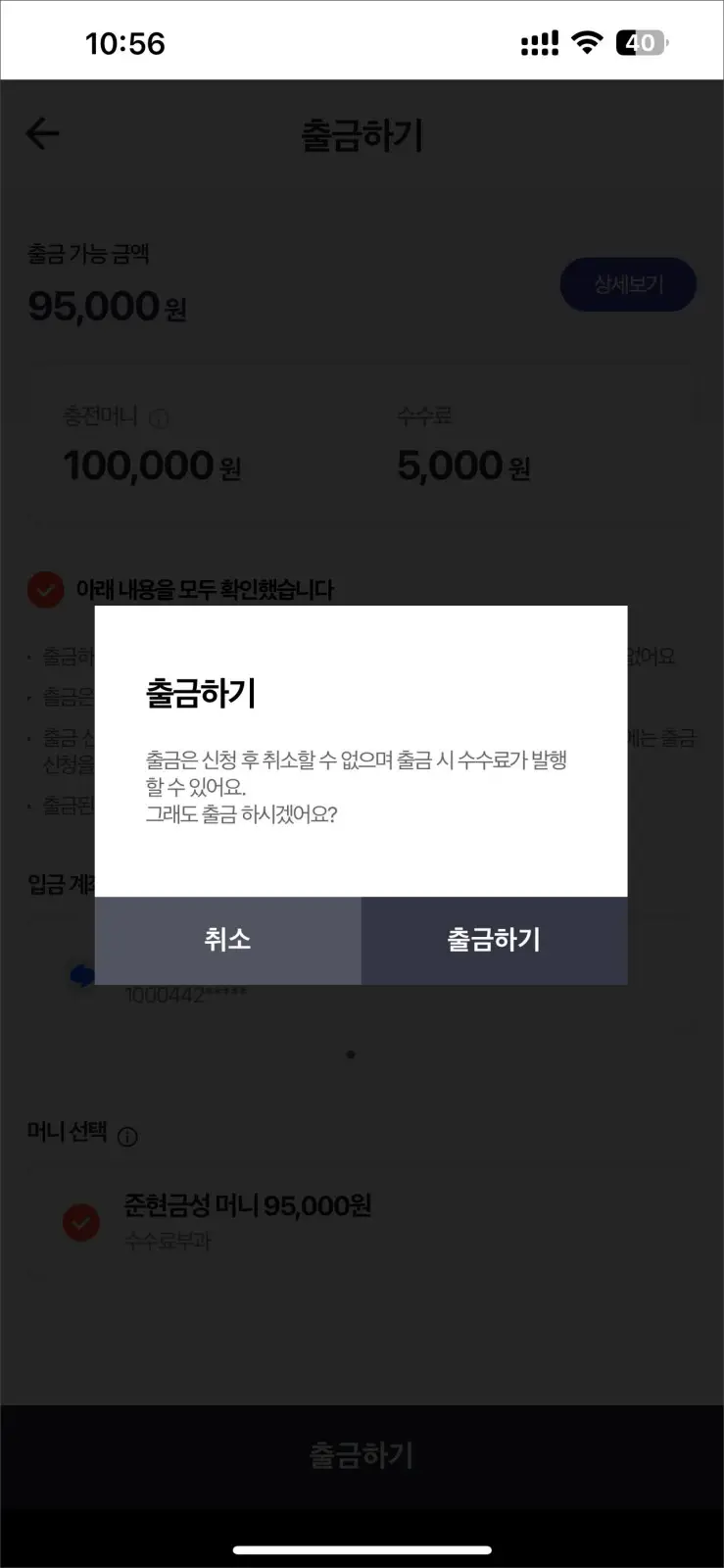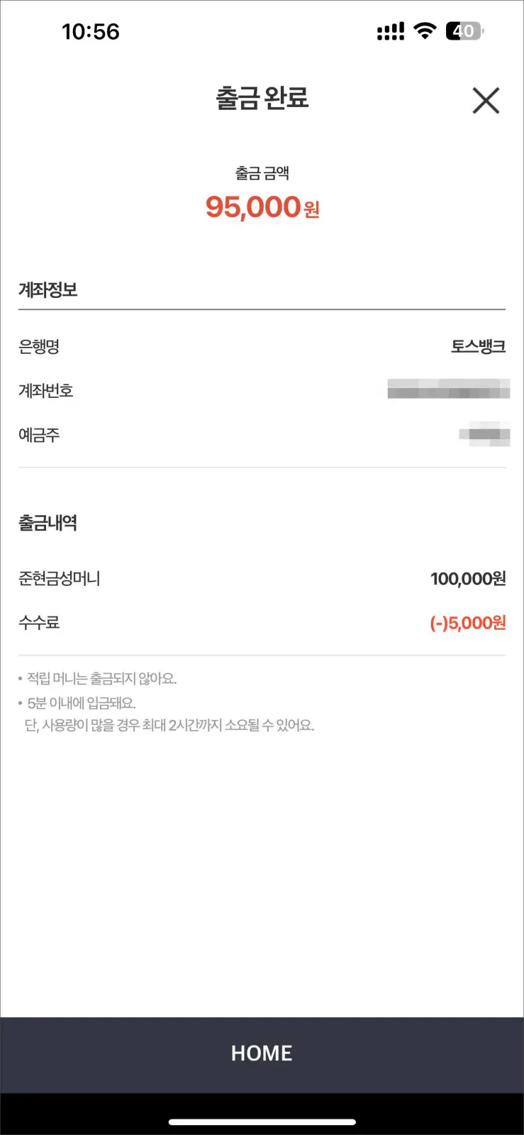 (5%의 출금 수수료가 발행하여 10만원 기준으로 95,000원이 계좌로 이체됩니다.)