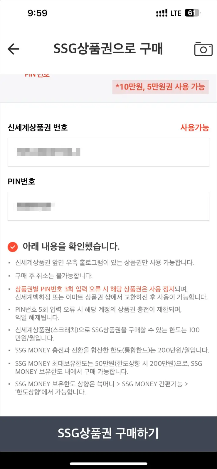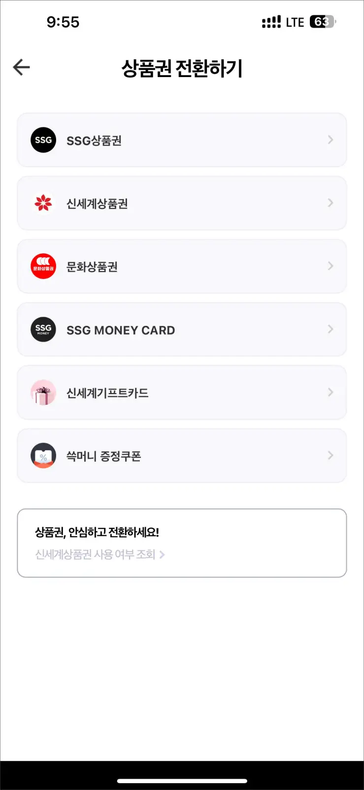 상품권을 SSG MONEY로 전환하면 SSG.COM에서 현금처럼 사용할 수 있습니다.- 방법: SSGPAY 앱에서 상품권을 SSG MONEY로 충전 후 계좌로 입금을 받을 수 있습니다.