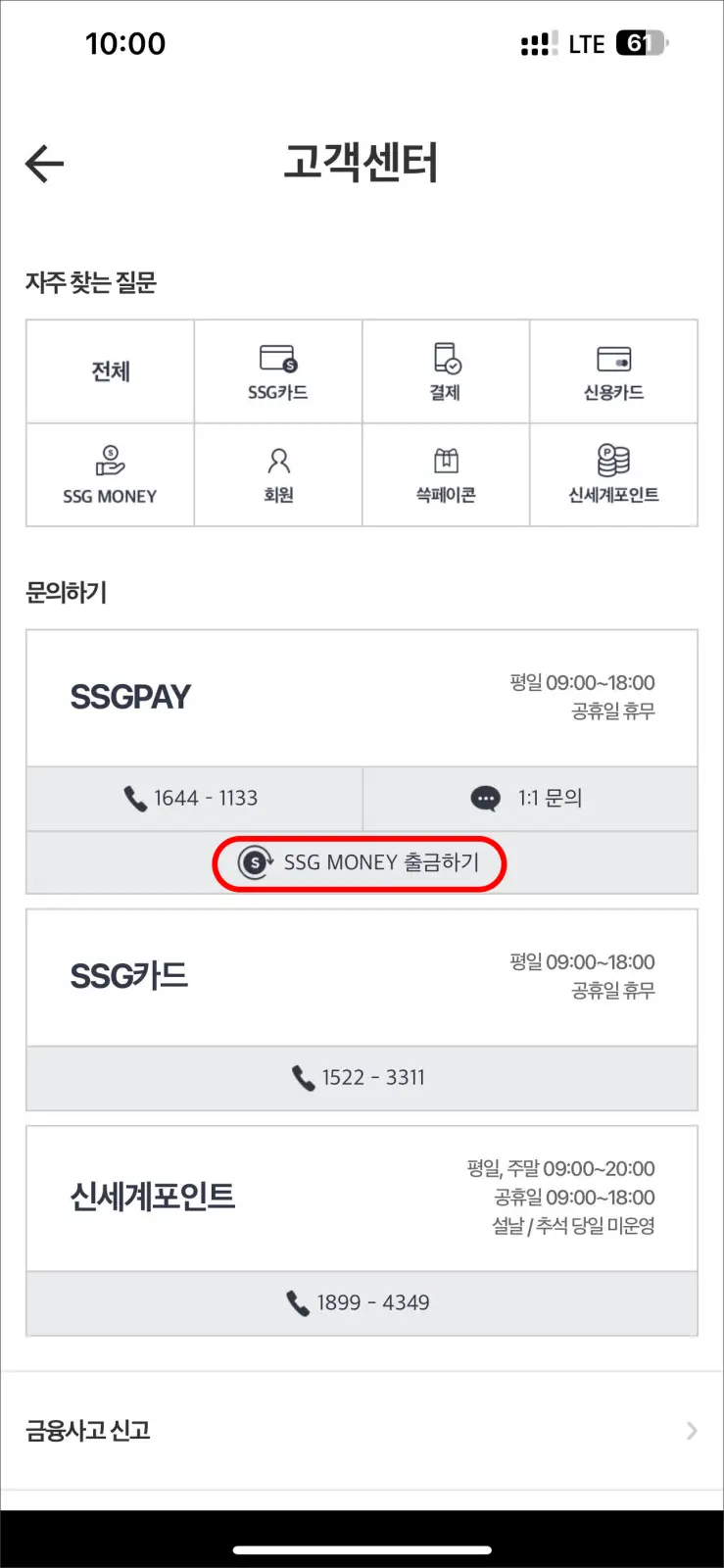 SSGPAY 앱에서 고객센터를 선택한 후 위와 같이 'SSG MONEY 출금하기'를 선택하면
