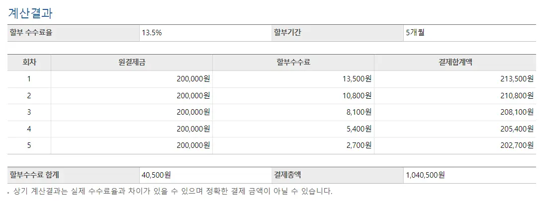 예를 들어 100만 원 짜리 물건을 5개월 할부로 구매했다면 아래와 같이 할부 수수료(이자)가 계산됩니다.