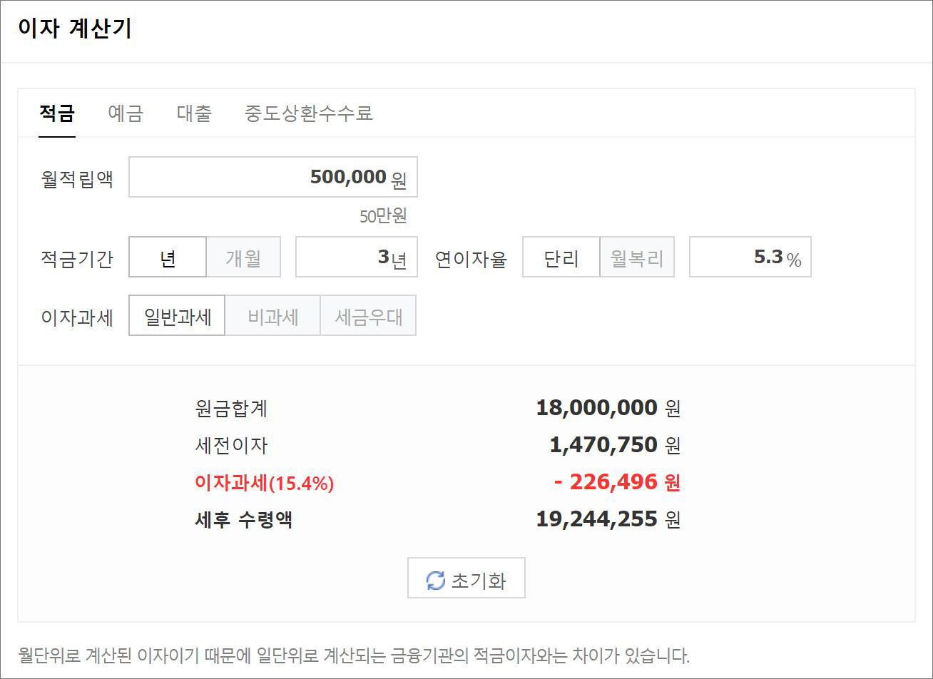 매월 50만원씩 적금을 납입했을 경우 원금은 1,800만원이며 세전이자는 1,470,750원 이고 세후 수령액은 19,244,255원 입니다.