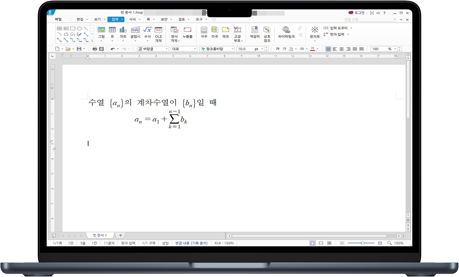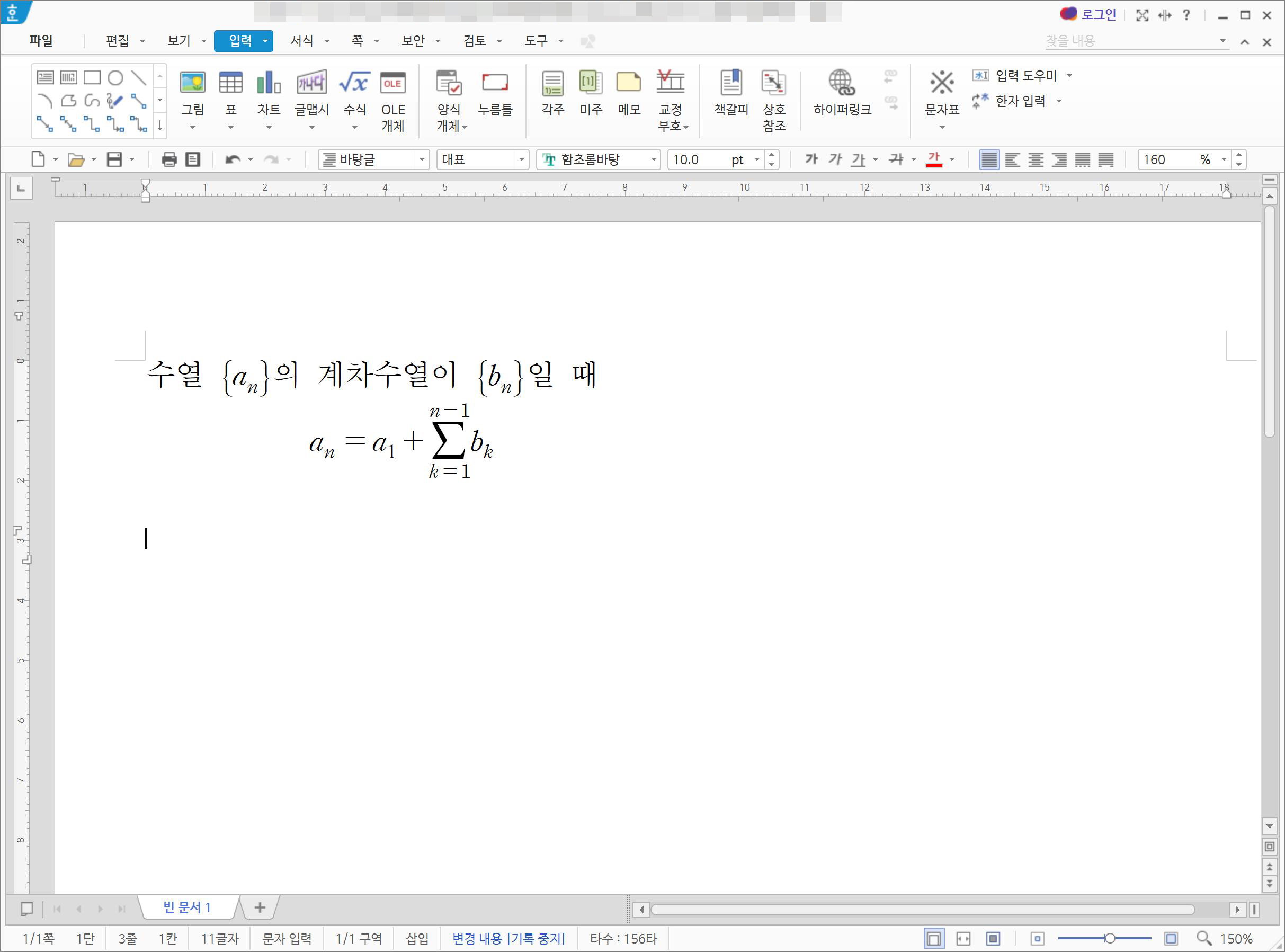 수식 입력은 상단 메뉴의 '입력' 탭에서 '수식' 아이콘을 선택하면 됩니다. 단축키는 Ctrl + n, m 으로 Ctrl 키를 누른 채 n 키와 m 키를 차례대로 누르면 됩니다.