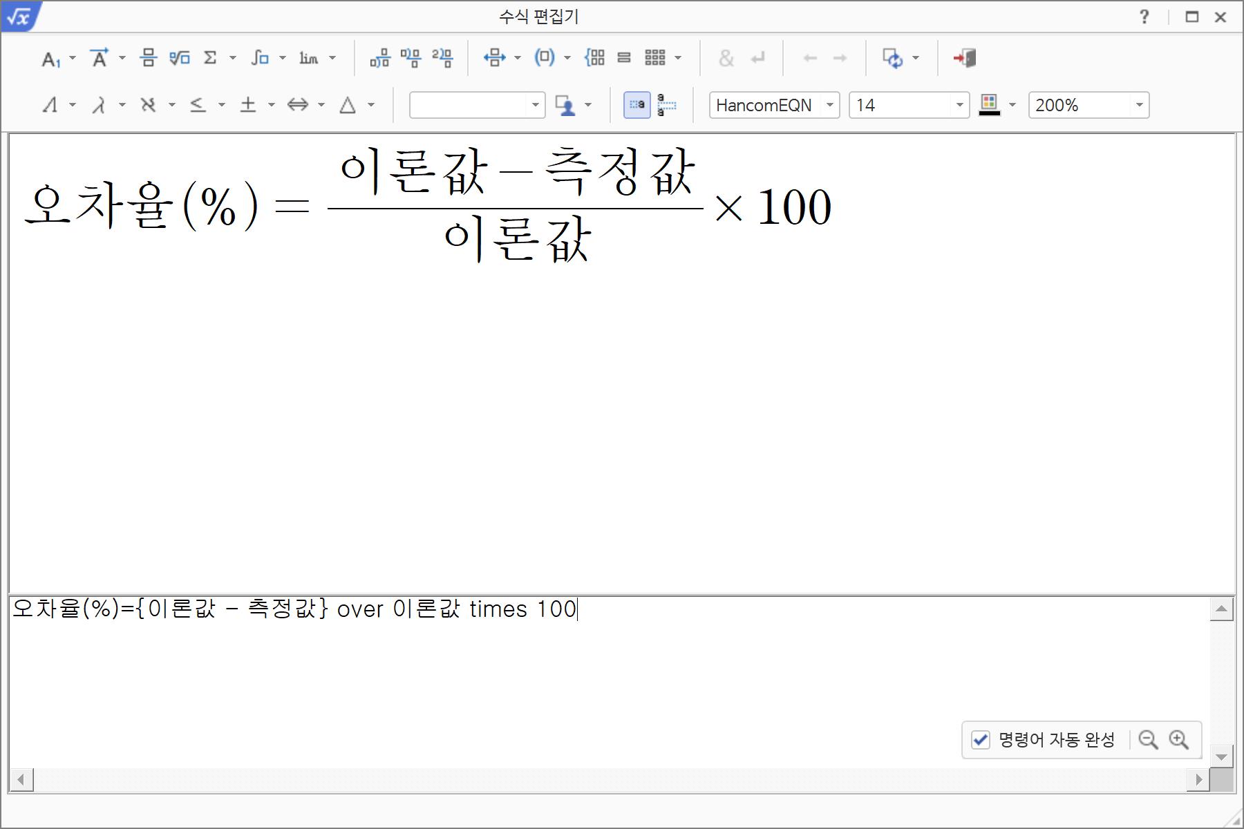 예제로 위의 공식을 한컴 수식 편집기로 편집해 보겠습니다.