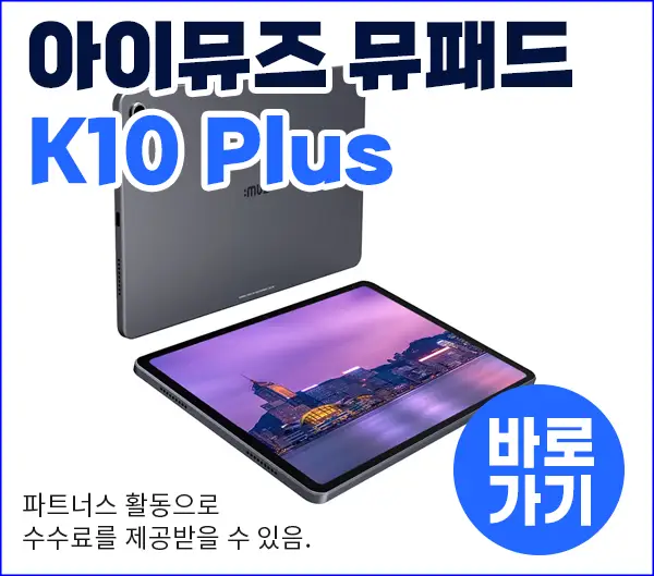 오늘은 10만원 초반의 가성비 태블릿인 아이뮤즈 뮤패드 K10 Plus에 대해 소개해 드리려고 합니다.