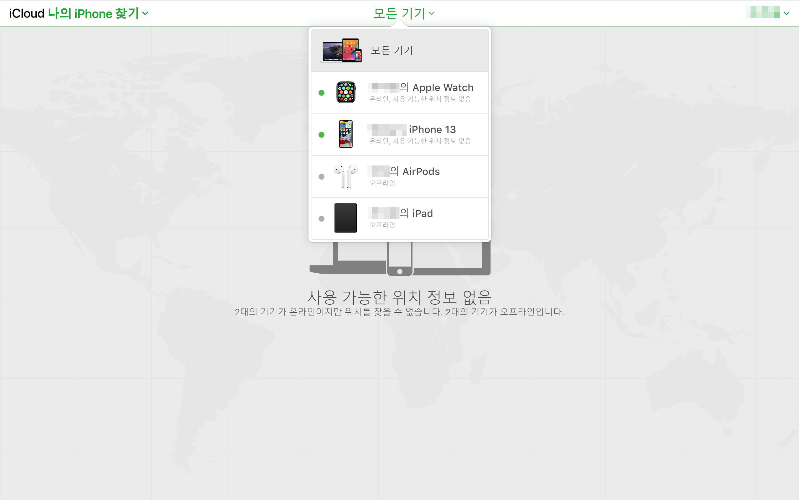 상단의 '모든 기기' 를 누르면 소유하고 있는 애플 기기들 목록이 나타납니다.