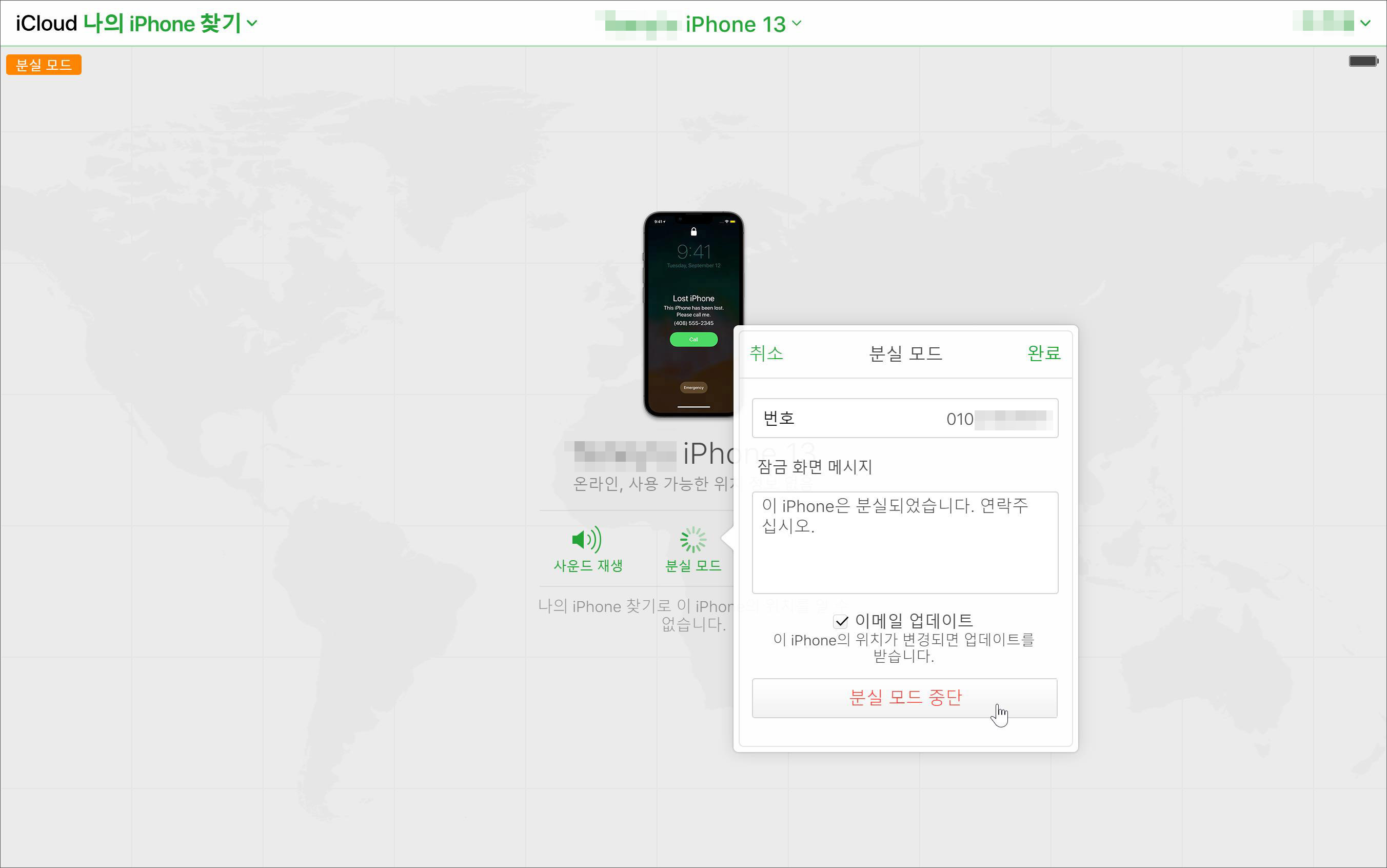 분실한 아이폰을 찾았을 경우에는 아이클라우드를 통해 본실 모드를 해제할 수 있습니다.