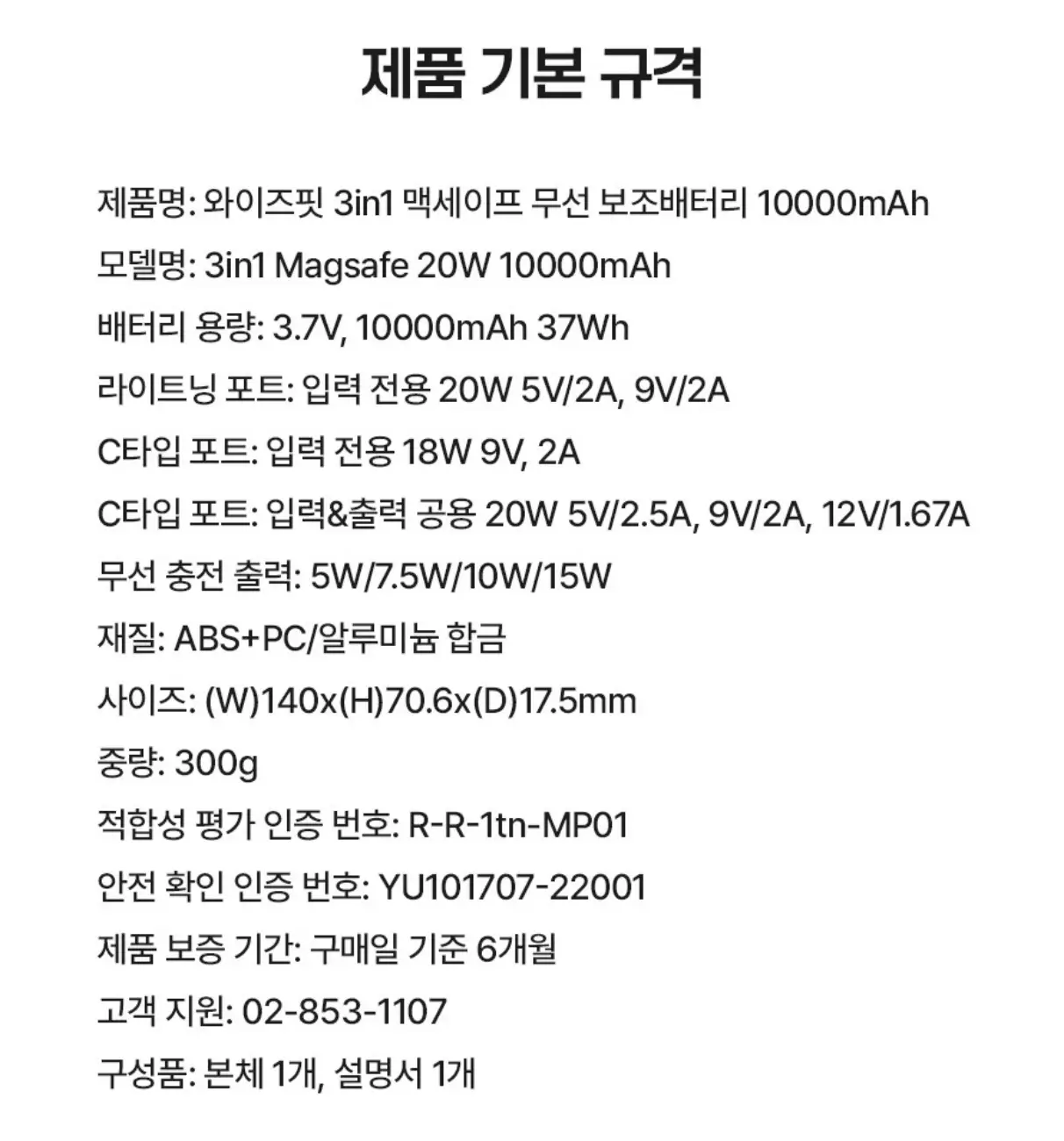 와이즈핏 3in1 맥세이프 PD 보조배터리 제품사양