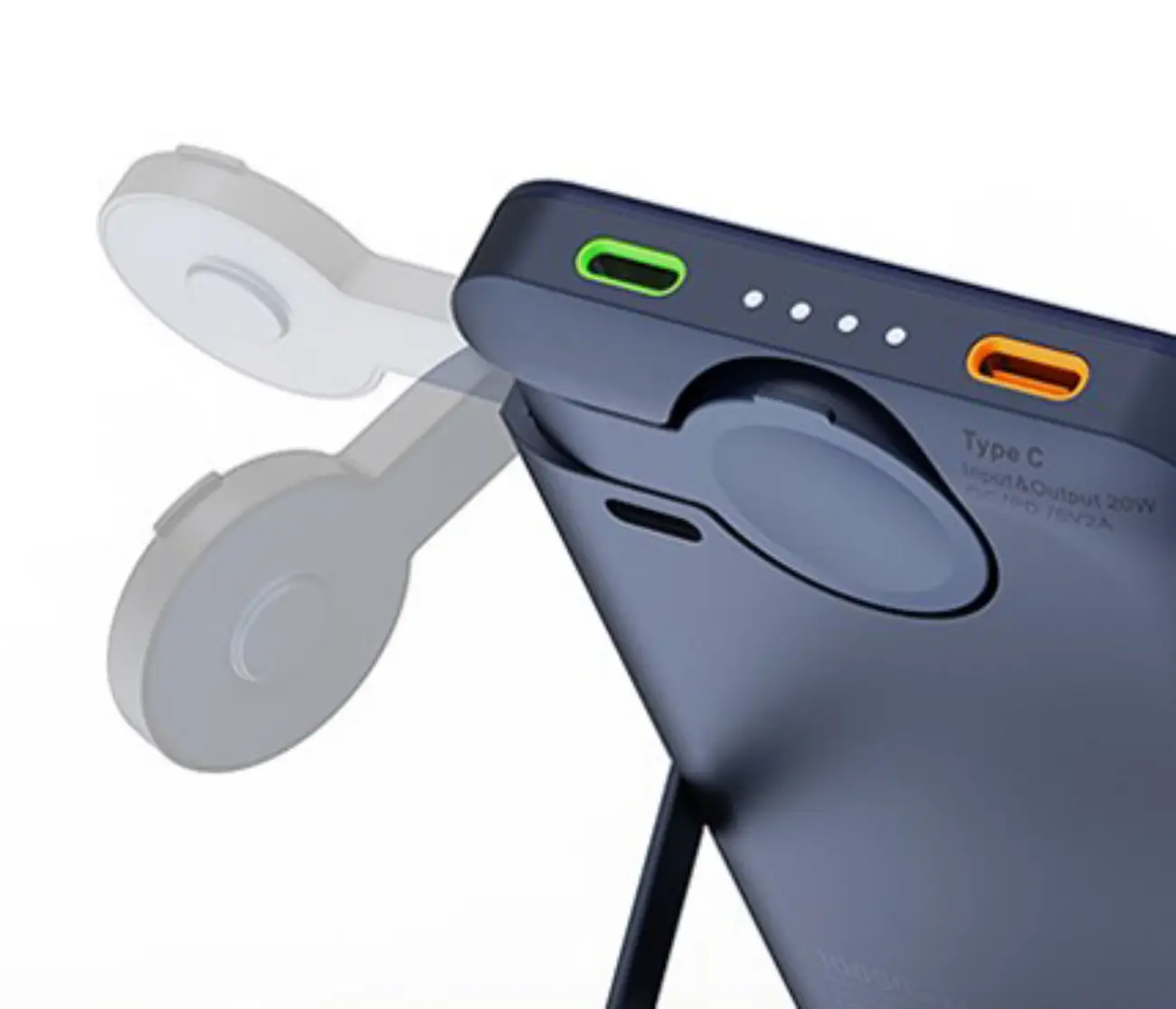 외형은 일반 보조배터리와 크게 다르지 않지만, 옆면에 접혀서 수납되는 애플워치 충전기가 내장되어 있어서 언제 어디서나 간편하게 애플워치 충전을 가능하게 해 줍니다.