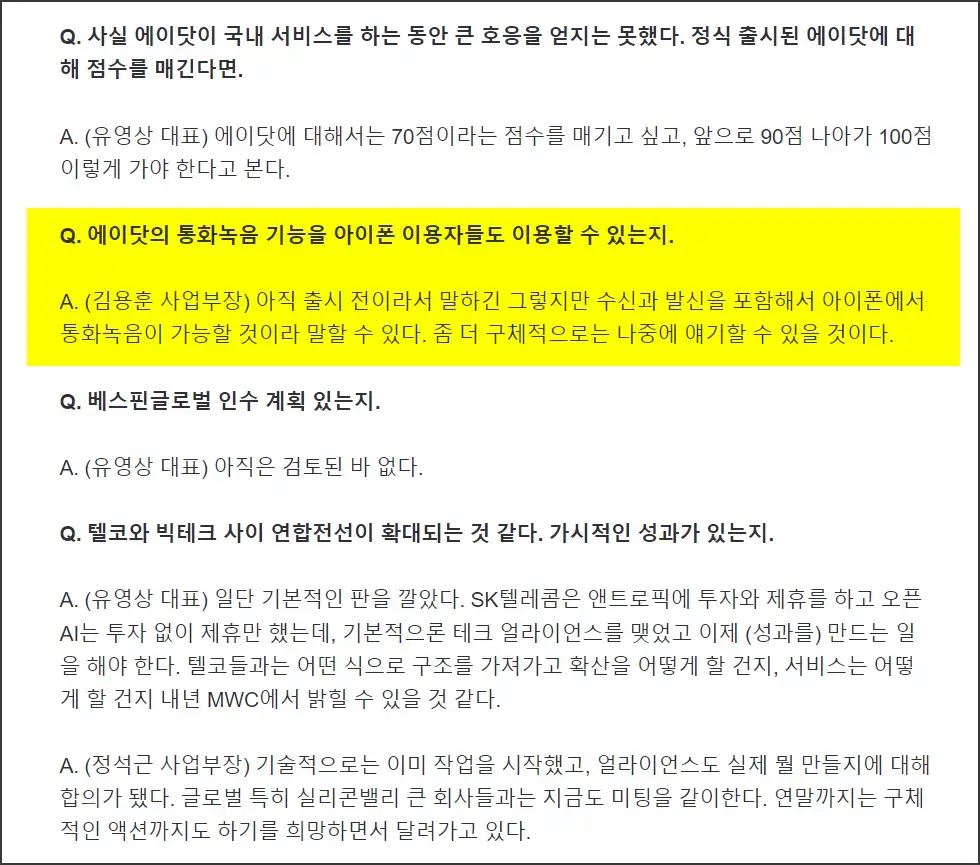 [일문일답] 유영상 SKT 대표 “‘에이닷’ 점수는 70점”…“아이폰 통화녹음 OK”
