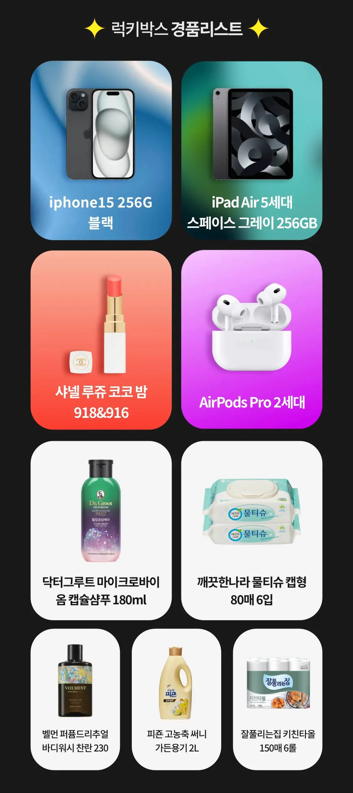 2023년 광군제 럭키박스에는 아이폰 15 256G, 아이패드 에어 5세대 256G, 에어팟 프로 2세대, 샤넬 루쥬 코코 밤 등 고가의 경품도 포함되어 있습니다.