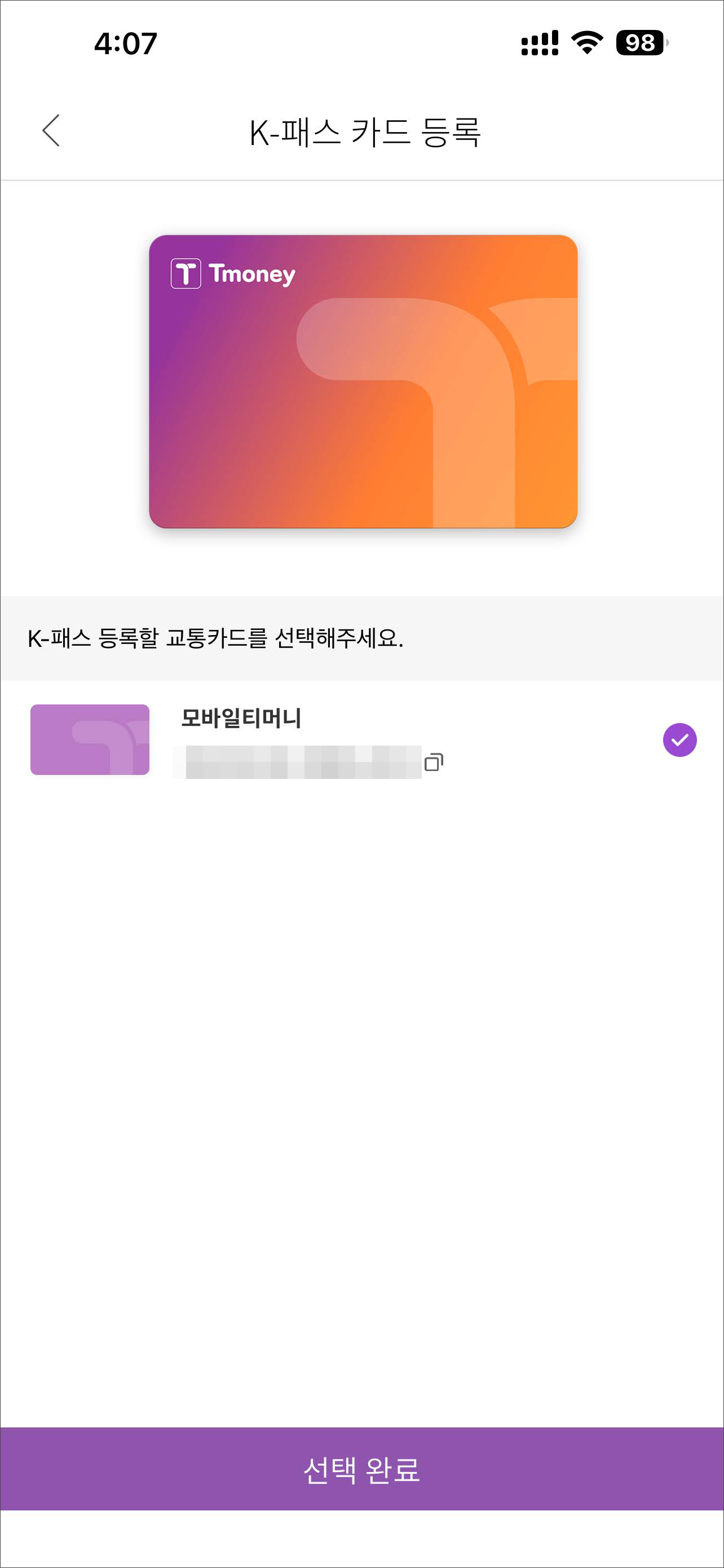 - 2단계: 발급받은 교통카드를 이용하여 K-패스 회원가입을 진행합니다. (K-패스 앱/홈페이지에서 발급된 카드번호 15~16자리를 입력하고 본인 인증 후 가입)