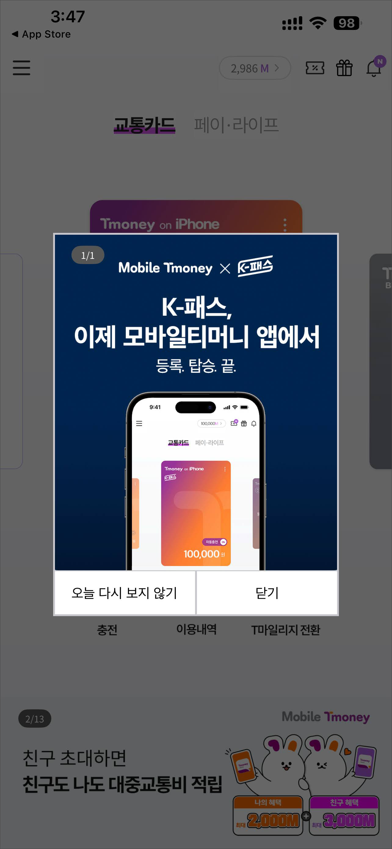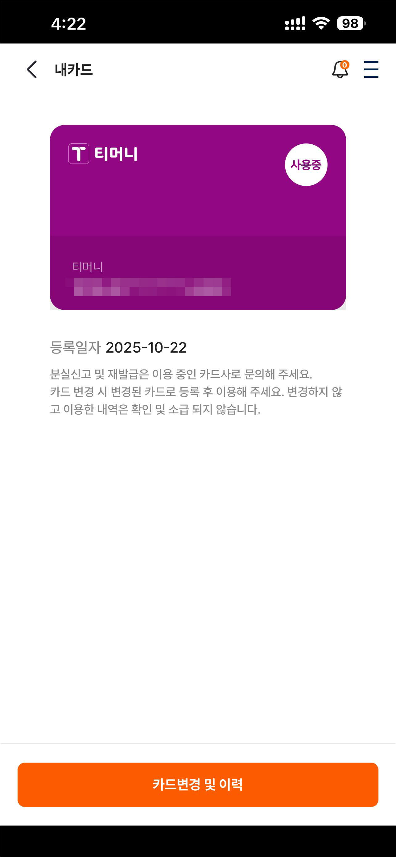 - 1단계: 모바일티머니 앱에서 교통카드를 발급받으세요.