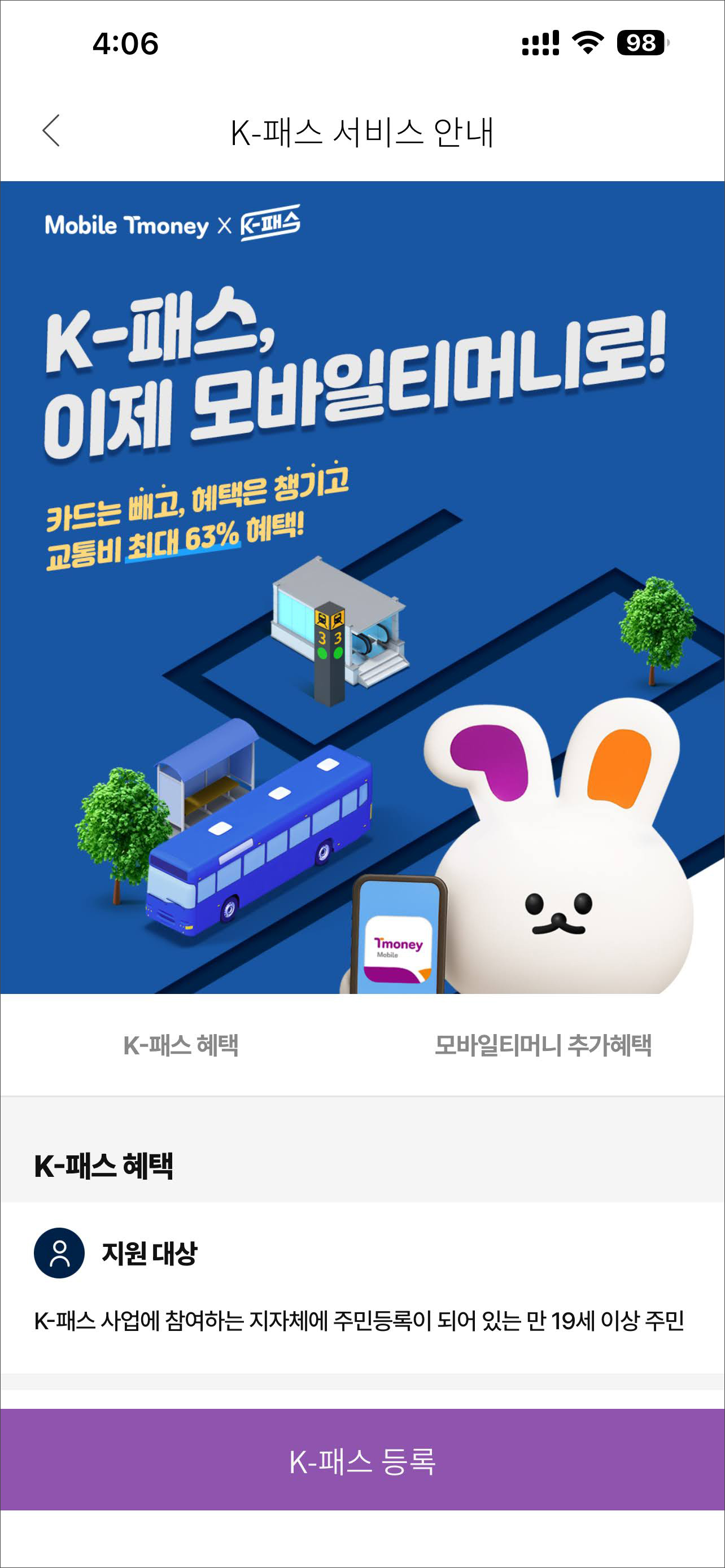 K-패스의 가장 큰 매력은 바로 이용자의 자격에 따라 환급률이 달라진다는 점입니다. 놓치지 말아야 할 환급률과 모바일티머니만의 추가 혜택을 자세히 살펴보세요.