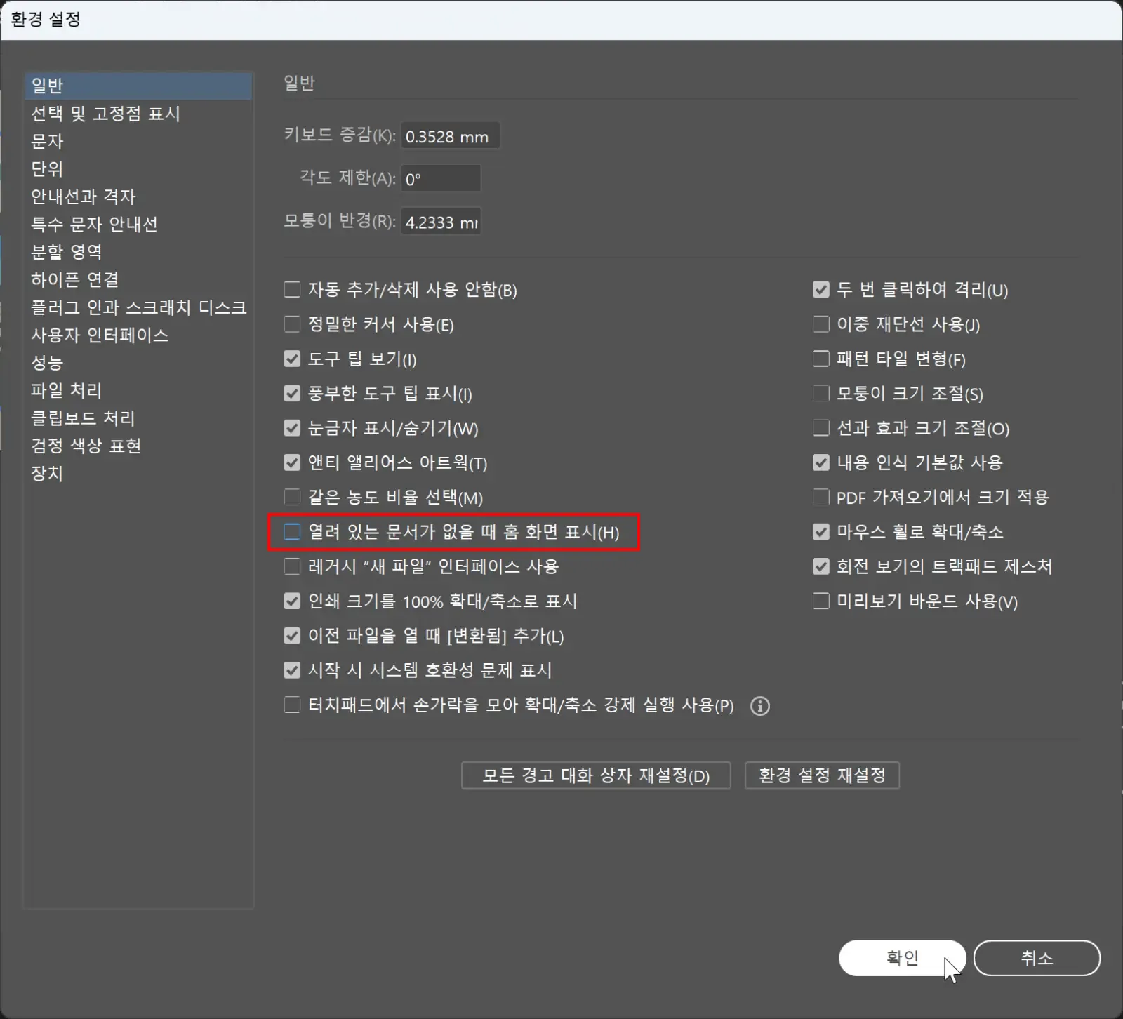 '일반' 환경 설정 창에 들어오셨다면, 이제 거의 다 왔어요! 이 창에서 시작화면을 제어하는 옵션을 찾아야 하는데요. 보통 '문서가 열려 있지 않을 때 홈 화면 표시(Show Home Screen When No Documents Are Open)'라는 체크박스 형태로 되어 있어요. 이걸 찾아 체크를 해제해주면 된답니다. 간단하죠? 저도 처음엔 어디 있는지 한참 찾았지 뭐예요. 숨바꼭질하는 기분이었달까? 😂
