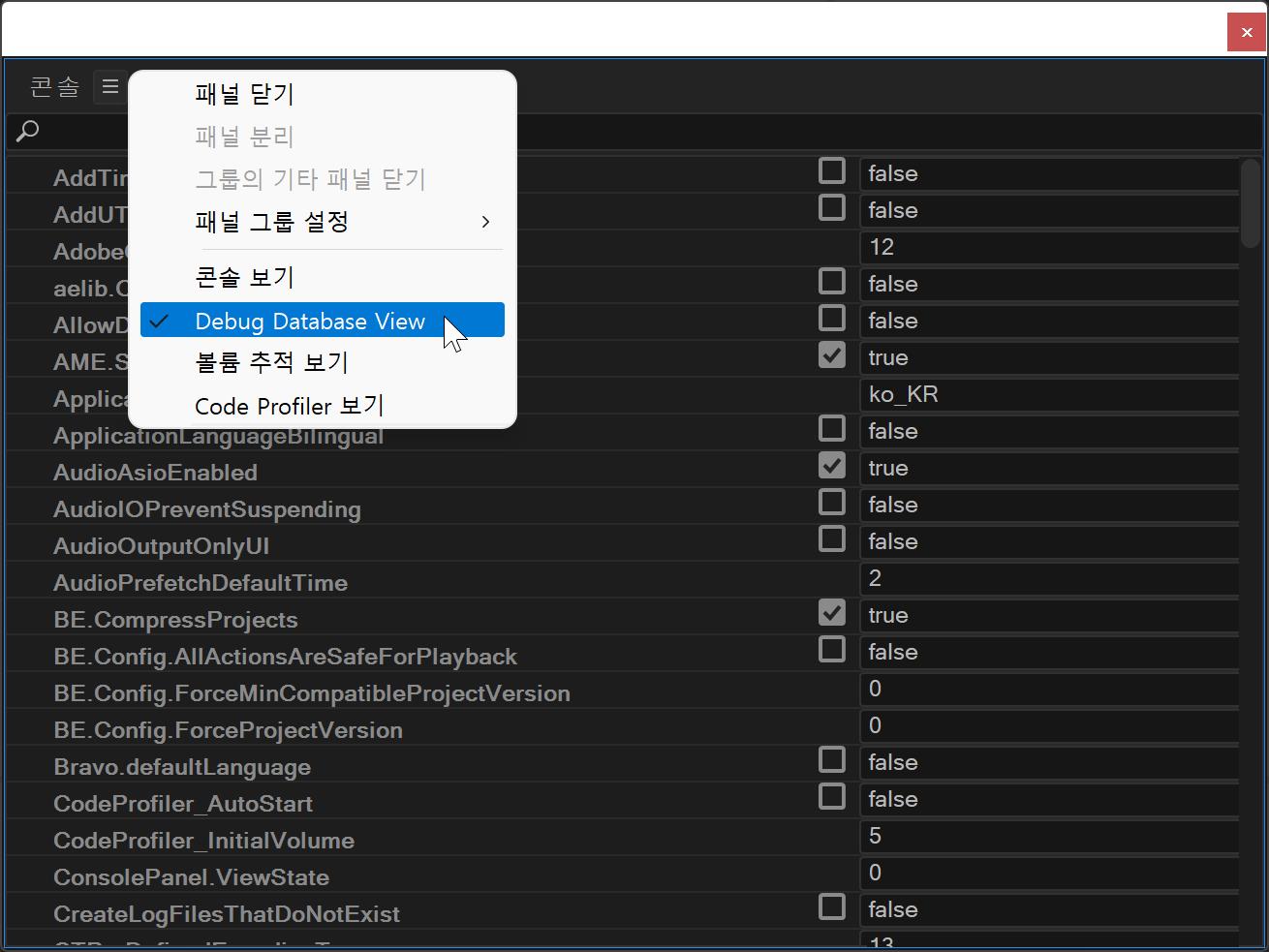 탭 ≡(아이콘)을 누른 후 Debug Database View 클릭합니다.