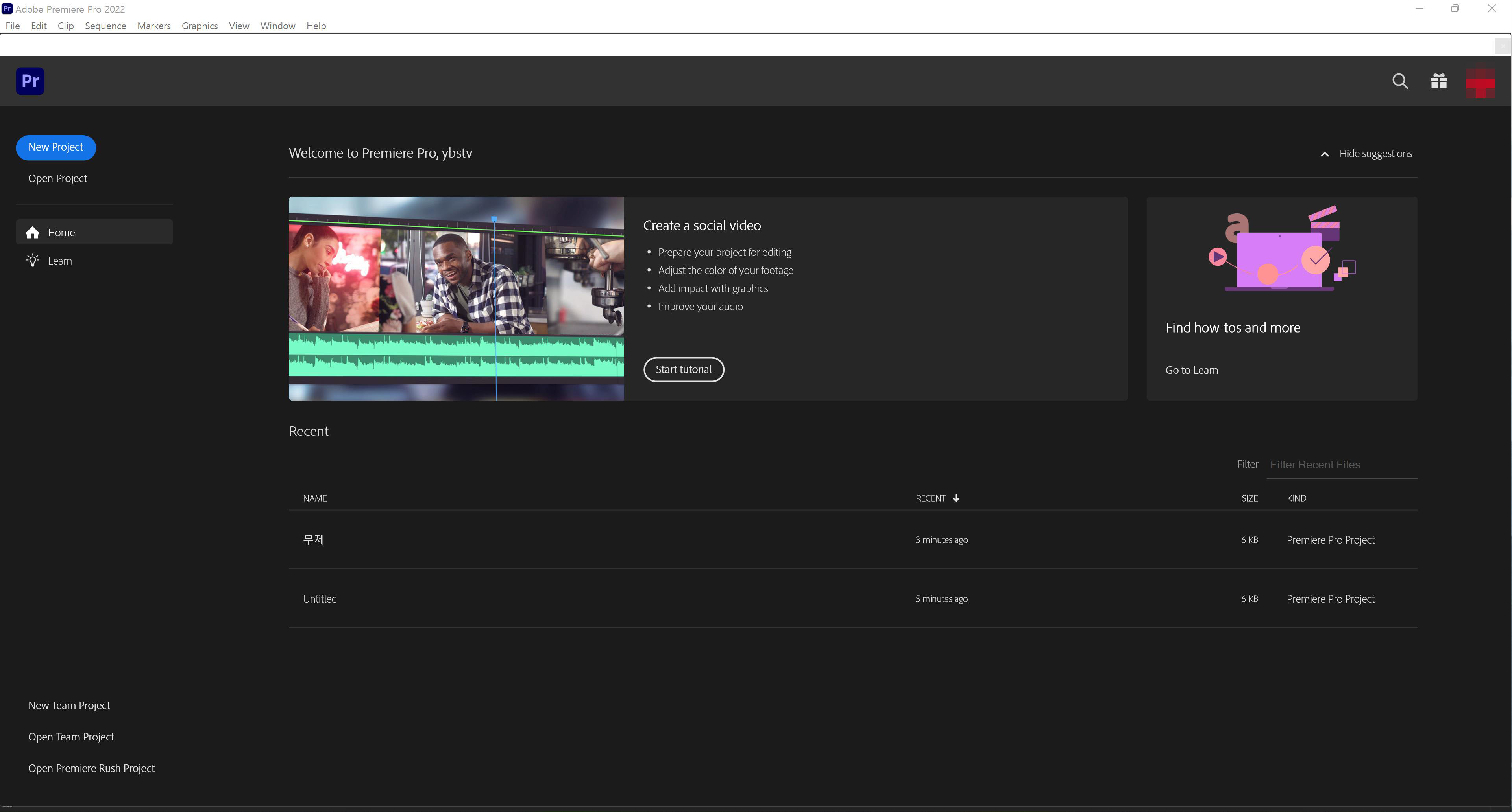 프리미어 프로를 종료 후 다시 실행하면 영문판으로 언어가 변경된 것을 확인할 수 있습니다.