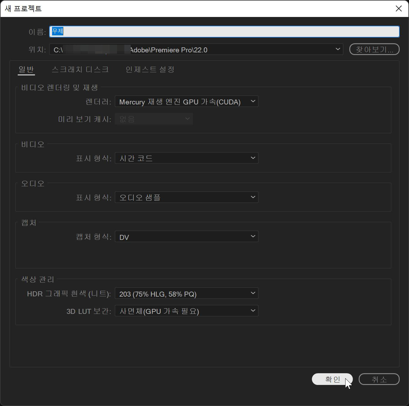 먼저 한글판 프리미어 프로(Premiere Pro)를 실행 후 새 프로젝트를 만듭니다.