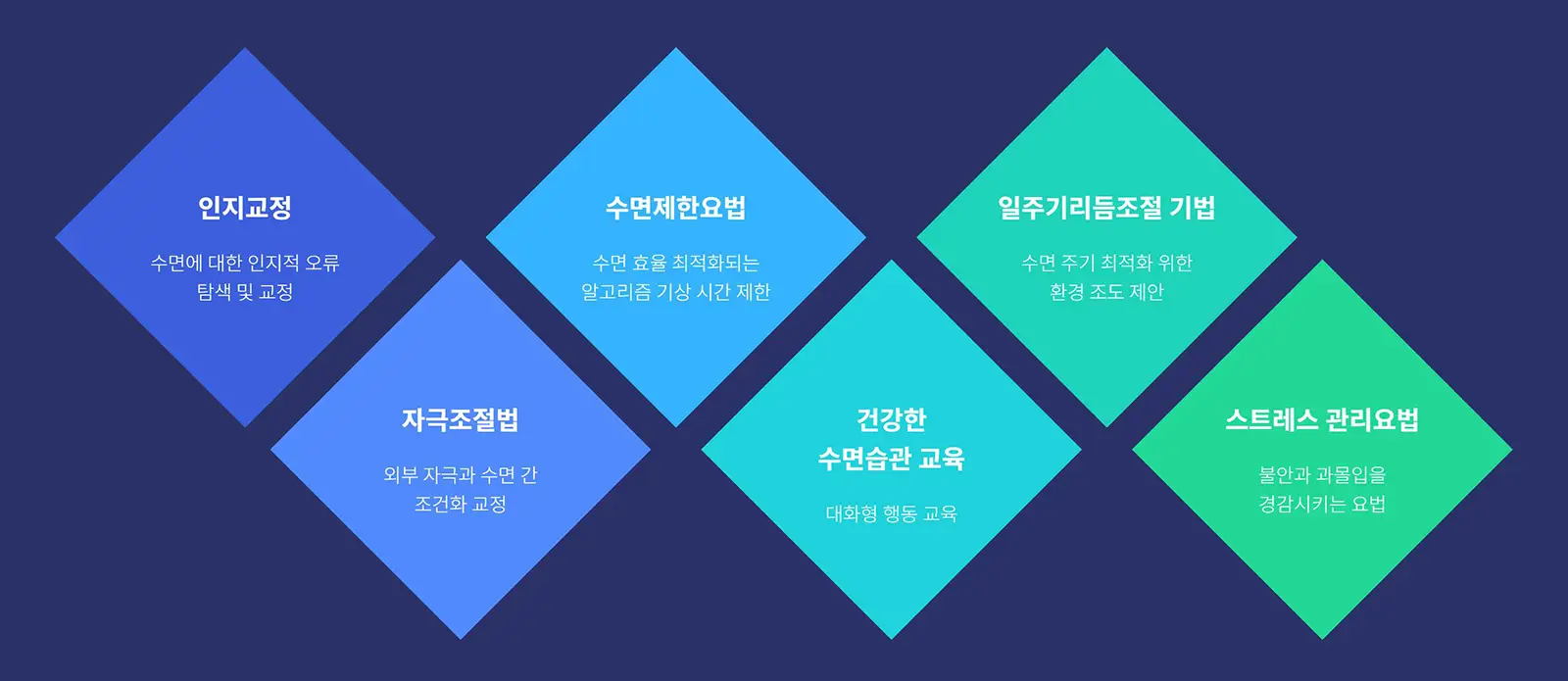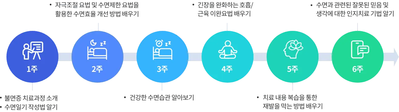 6단계의 프로그램을 6주~9주 동안 수행해야 불면증 증상개선의 효과를 기대할 수 있다고 합니다.