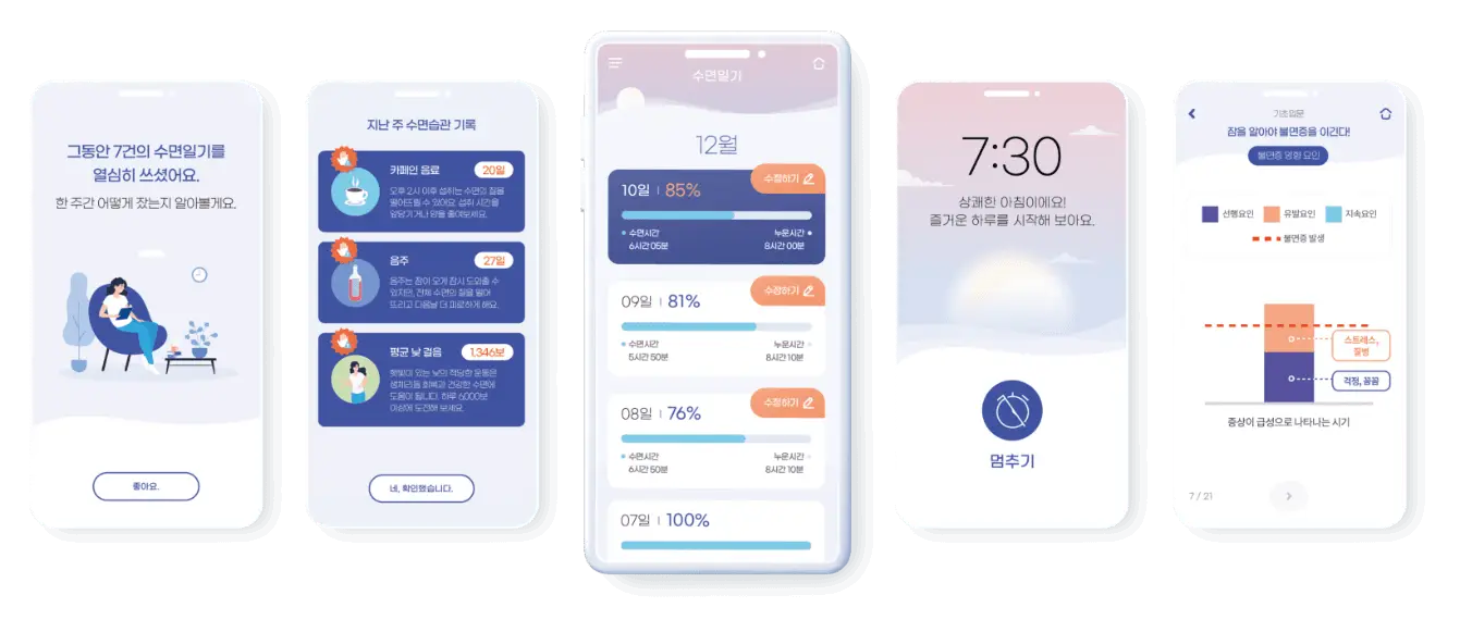 솜즈는 불면증 환자가 모바일 앱이 제공하는 △수면 습관 교육 △실시간 피드백 △행동 중재 등을 6~9주 간 수행함으로써 수면의 효율을 높여 환자의 불면증을 개선하는 원리로 작동된다.