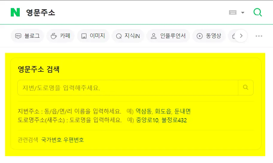 네이버 검색창에 '영문주소'를 입력하면 상단에 '영문주소 검색'을 확인할 수 있습니다.