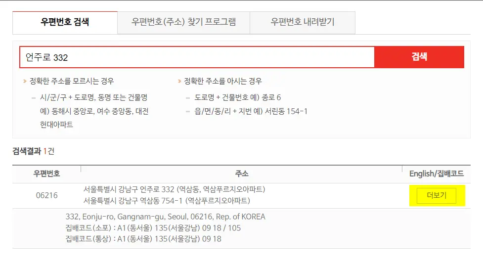 전체 주소를 합치면 "101-202, 332 Eonju-ro, Gangnam-gu, Seoul, 06216, Republic of Korea"이 됩니다.
