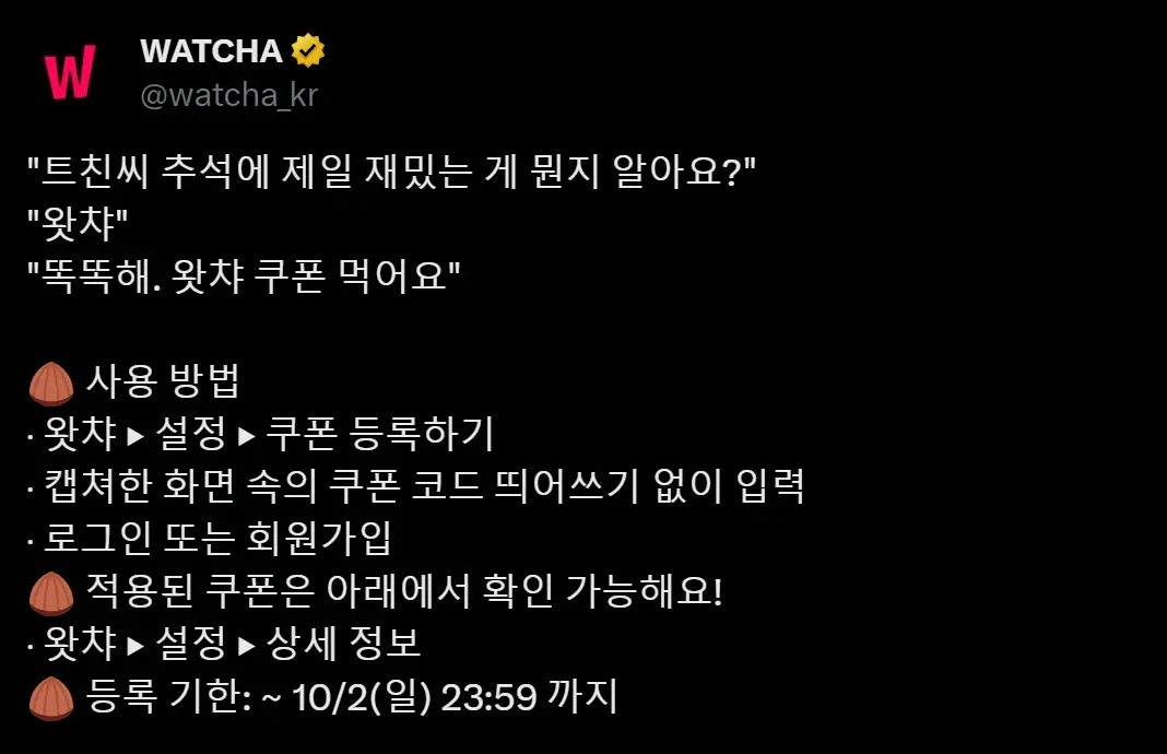 왓챠는 트위터(X)를 통해 24시간 무료 이용 쿠폰 코드를 공개했습니다.