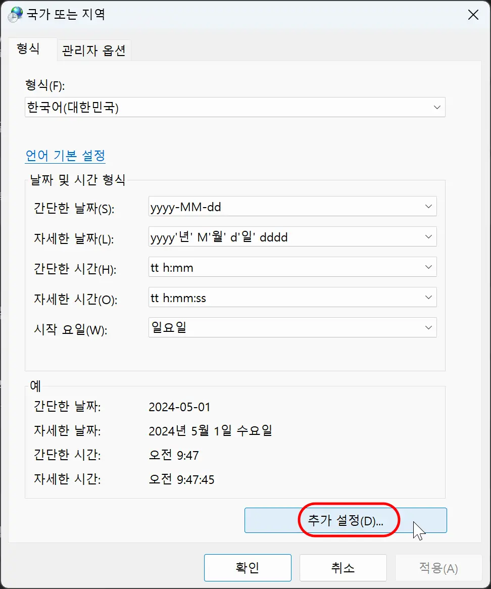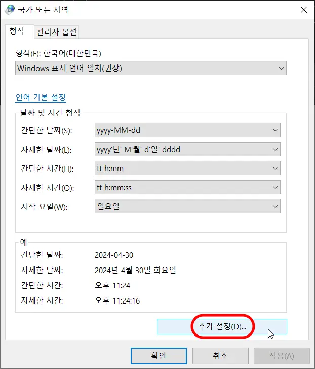'국가 또는 지역' 대화창에서 아래의 '추가 설정'을 선택합니다.