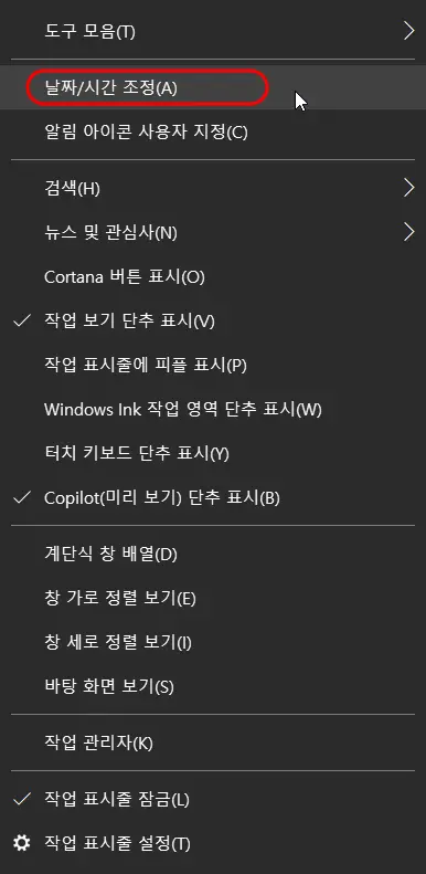 위와 같이 작업표시줄의 시계/날짜 부분에서 마우스 오른쪽 버튼을 클릭하여 '날짜/시간 조정'을 선택합니다.