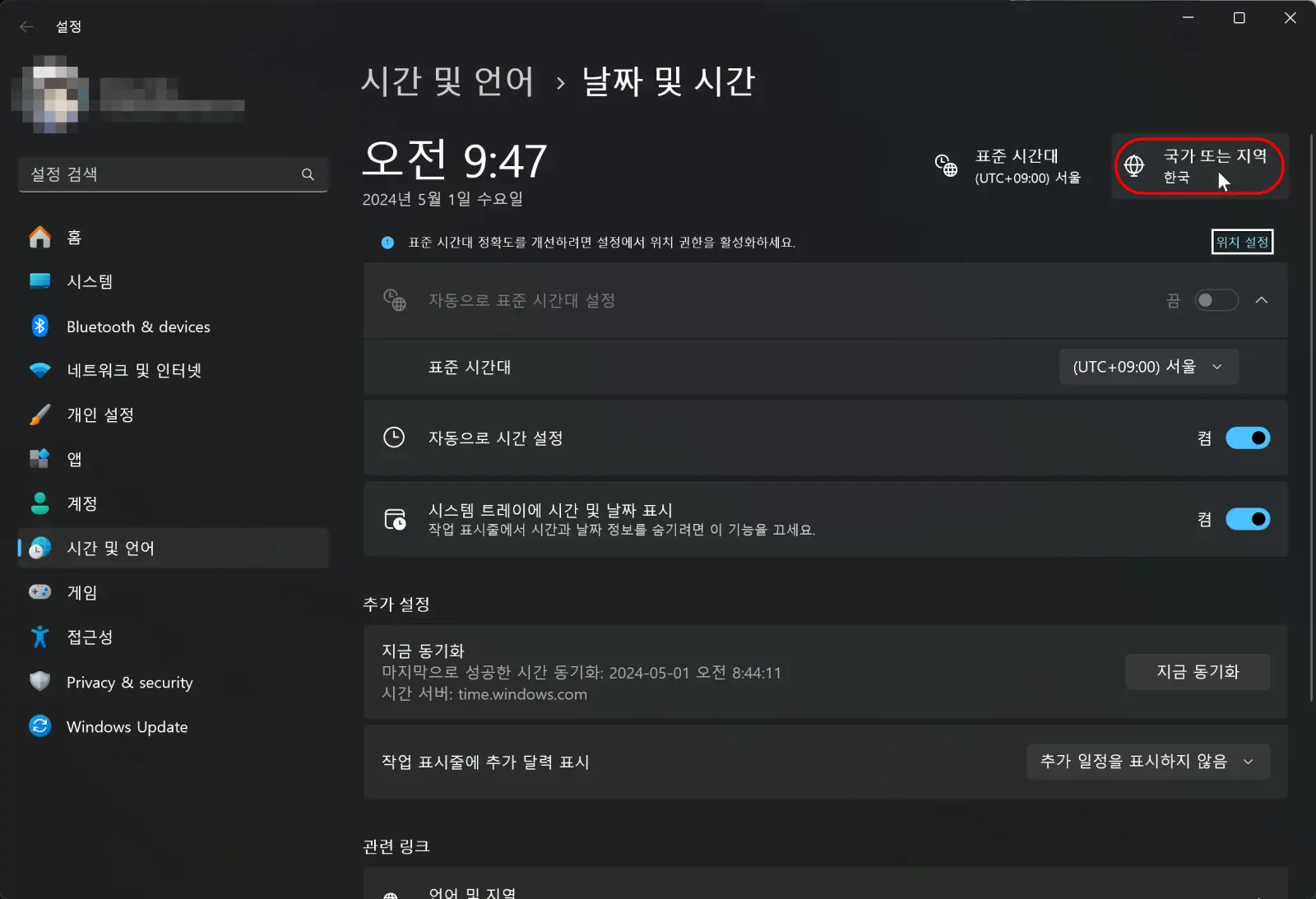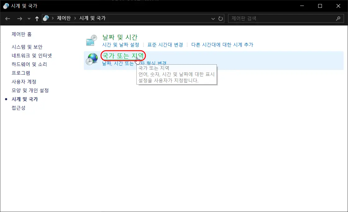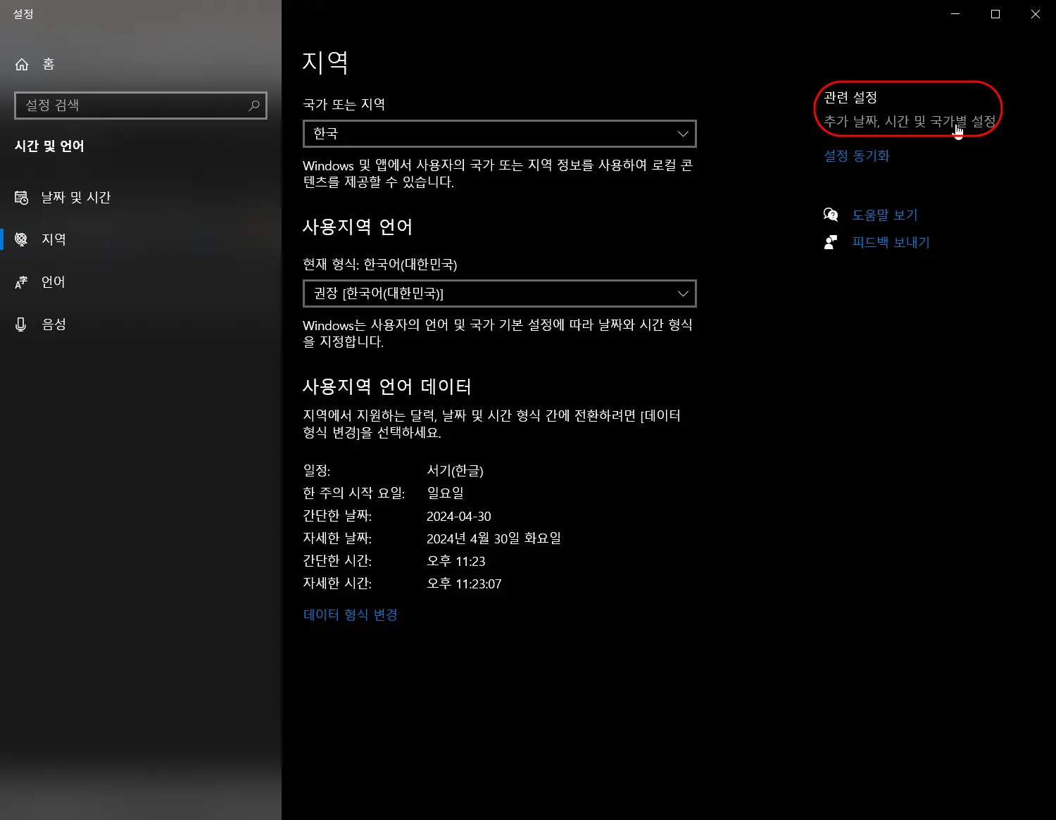우측 상단의 '추가 날짜, 시간 및 국가별 설정'을 선택합니다.