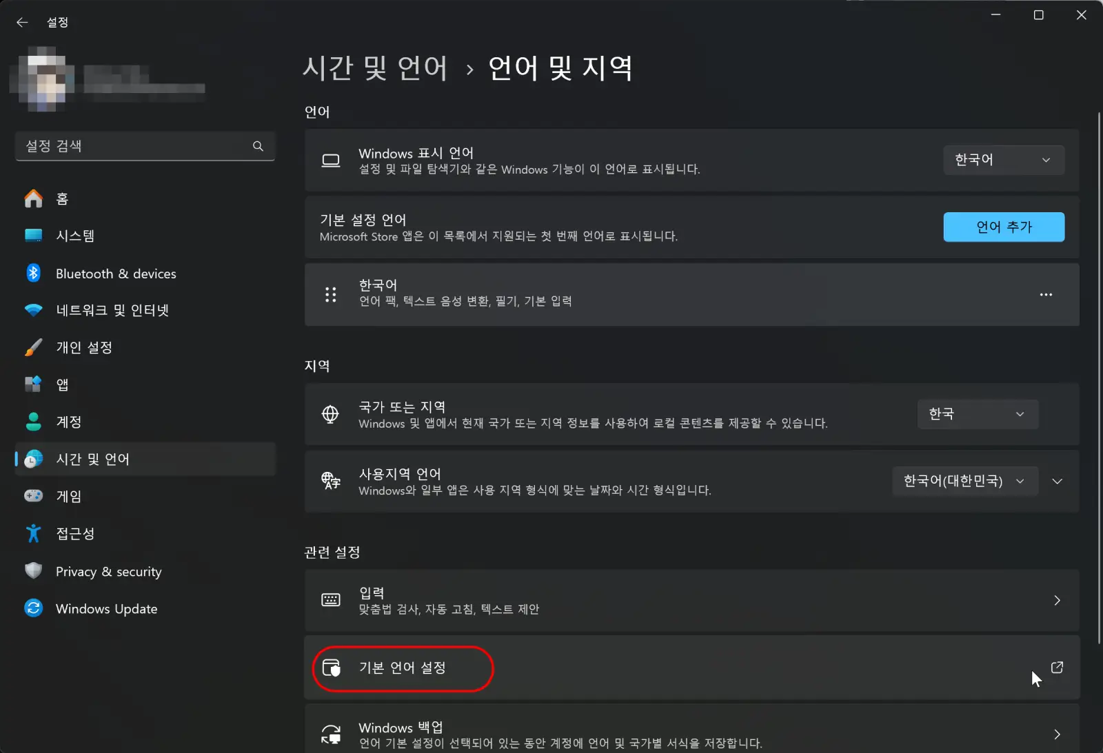 하단의 '기본 언어 설정'을 선택합니다.