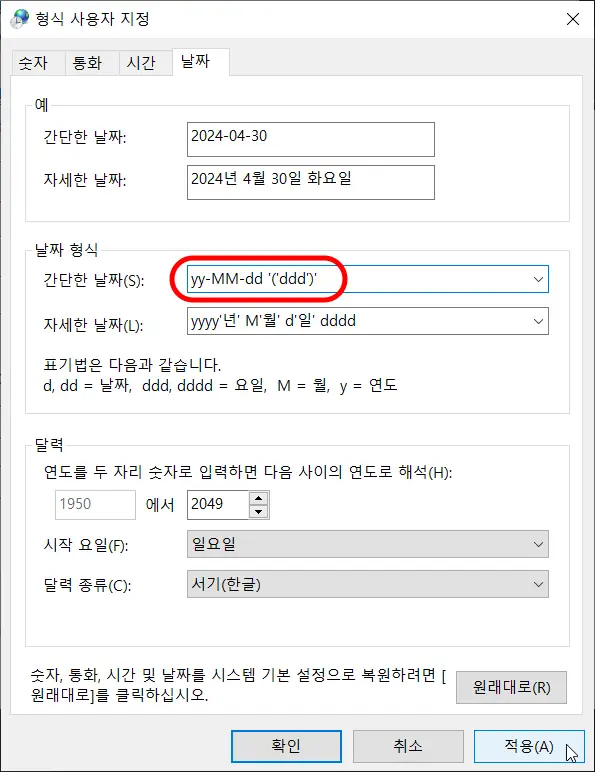 '간단한 날짜' 부분에 위와 같이 입력을 하면