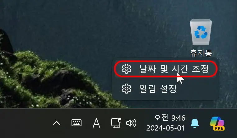 먼저 위와 같이 작업표시줄 시계 부분에서 마우스 오른쪽 버튼을 클릭하여 '⚙️ 날짜 및 시간 조정'을 선택합니다.