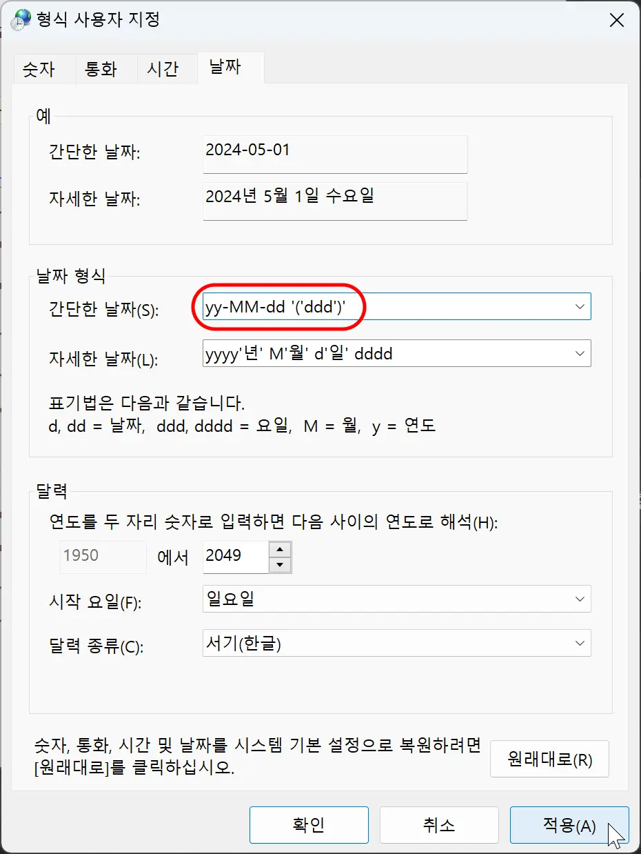 '간단한 날짜' 부분에 위와 같이 입력을 하면
