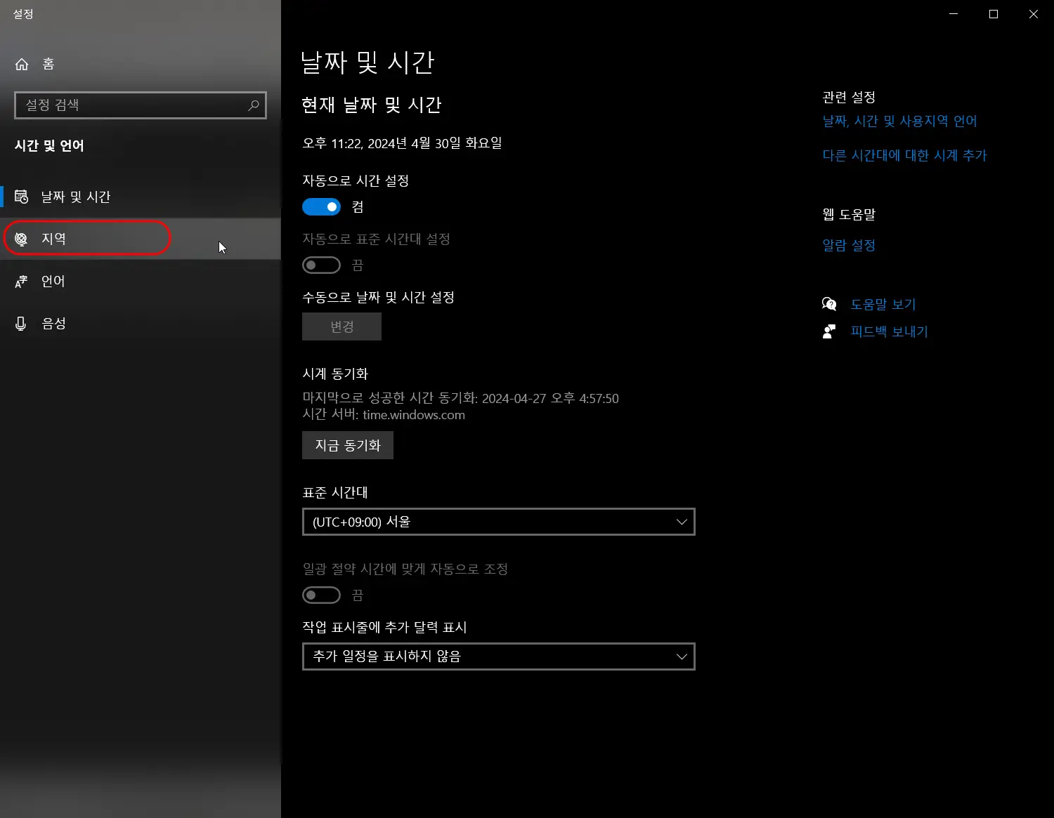 우측 상단의 '추가 날짜, 시간 및 국가별 설정'을 선택합니다.