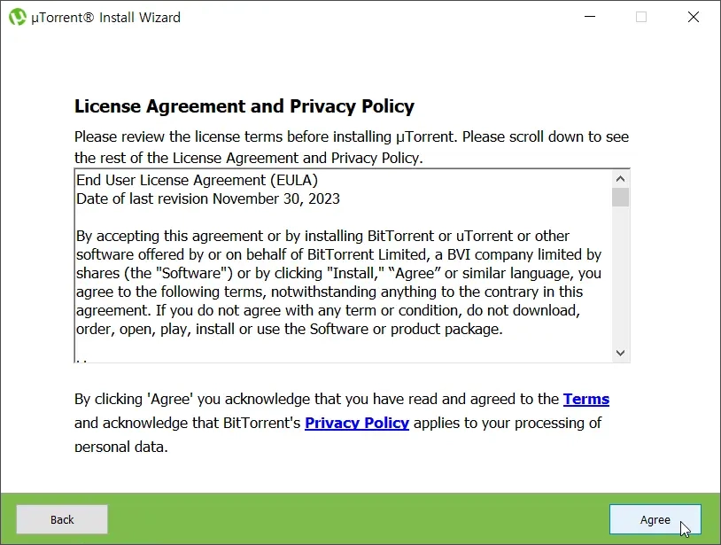 4. 다운로드한 유토렌트(uTorrent) 설치 실행 파일을 실행하여 설치 마법사의 지시에 따라 설치를 완료합니다.