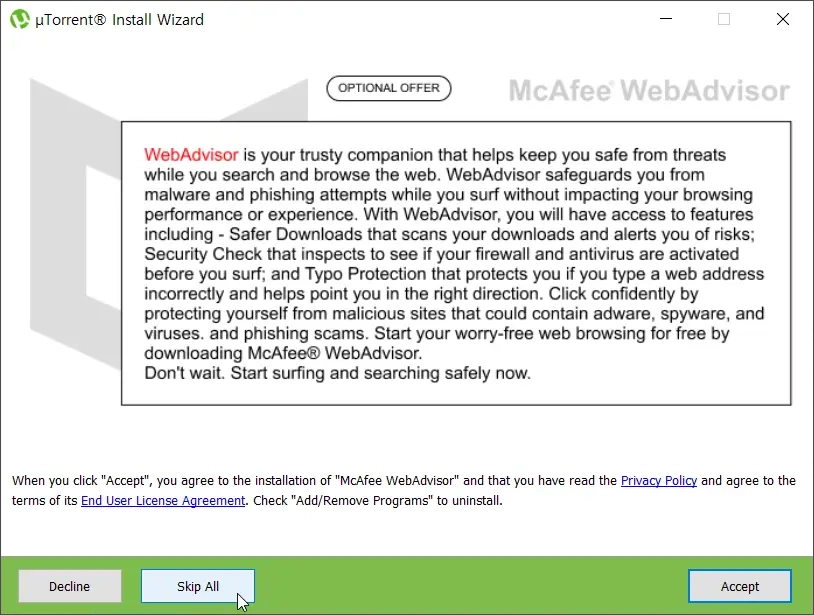 McAfee 등 추가 프로그램은 설치하지 않고 'Skip All'을 선택합니다.