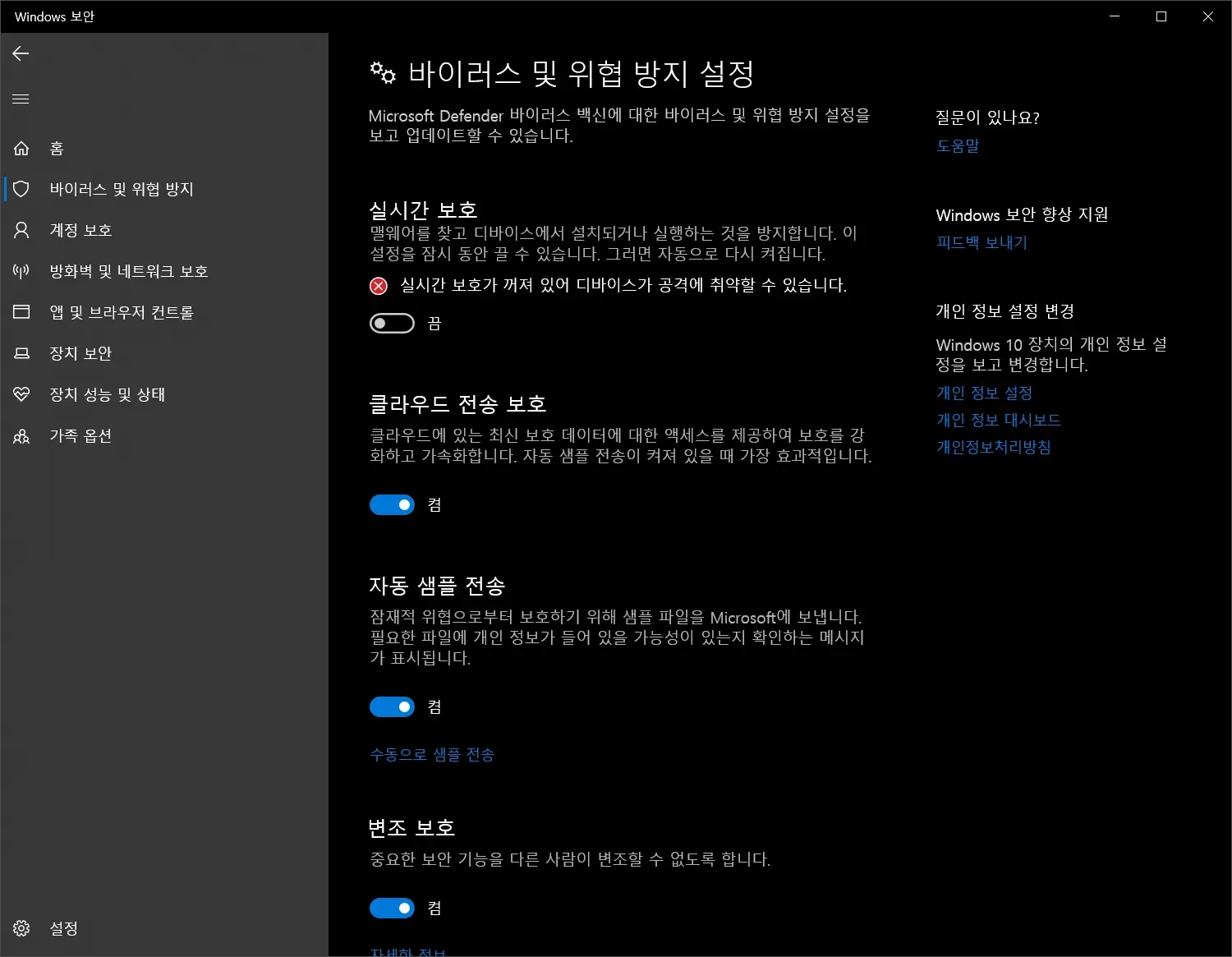 3. 윈도우 디펜더 등 백신 프로그램을 사용 중이라면 잠시 백신의 실시간 보호 기능을 꺼 두는 것이 좋습니다.