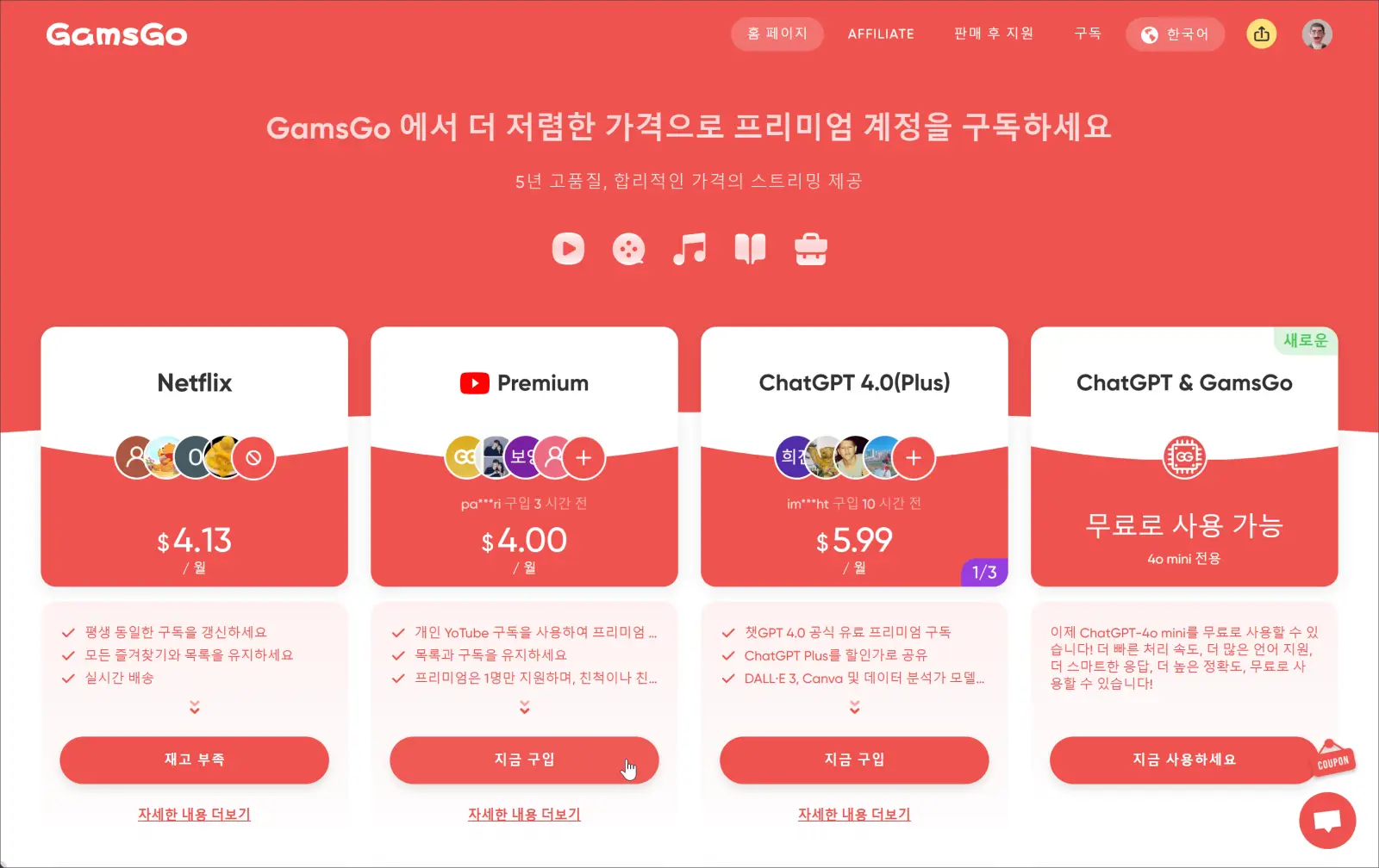 대표적인 공유 플랫폼으로는 '겜스고(GamsGo)'가 있으며, 이를 통해 유튜브 프리미엄을 월 4천 원대에 이용할 수 있습니다.