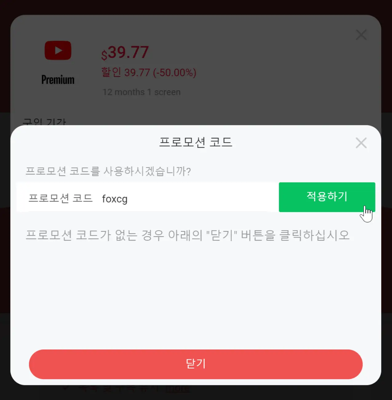 그리고 아래의 프로모션 코드를 입력하면 5% 더 할인이 적용되어 12개월 기준 $39.77(약 5만 2천원) 가격으로 이용할 수 있습니다. 정가 12만 5400원에 비하면 42% 가격에 유튜브 프리미엄을 즐길 수 있습니다. 유튜브 프리미엄 구독료는 매달 세금처럼 지출되는 금액이므로 구독료를 조금이라도 아끼는 것이 좋습니다.